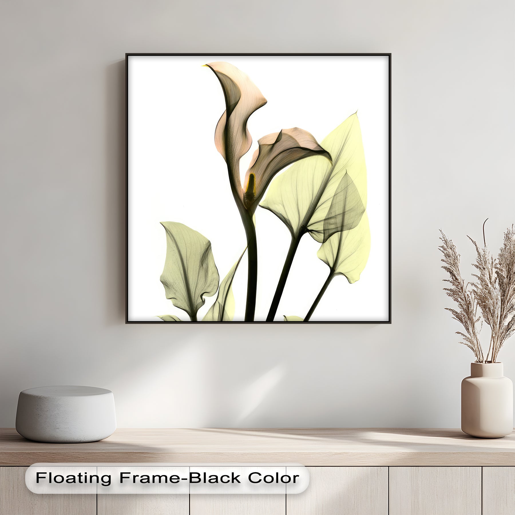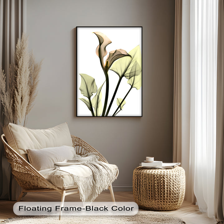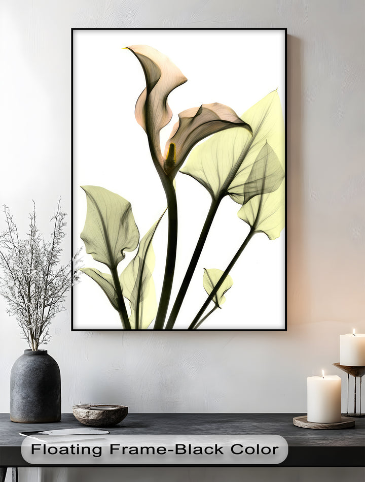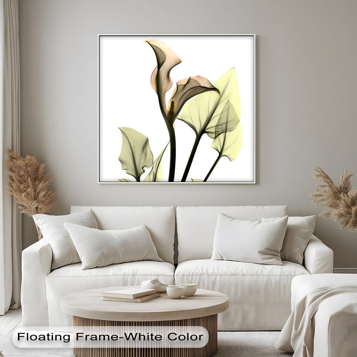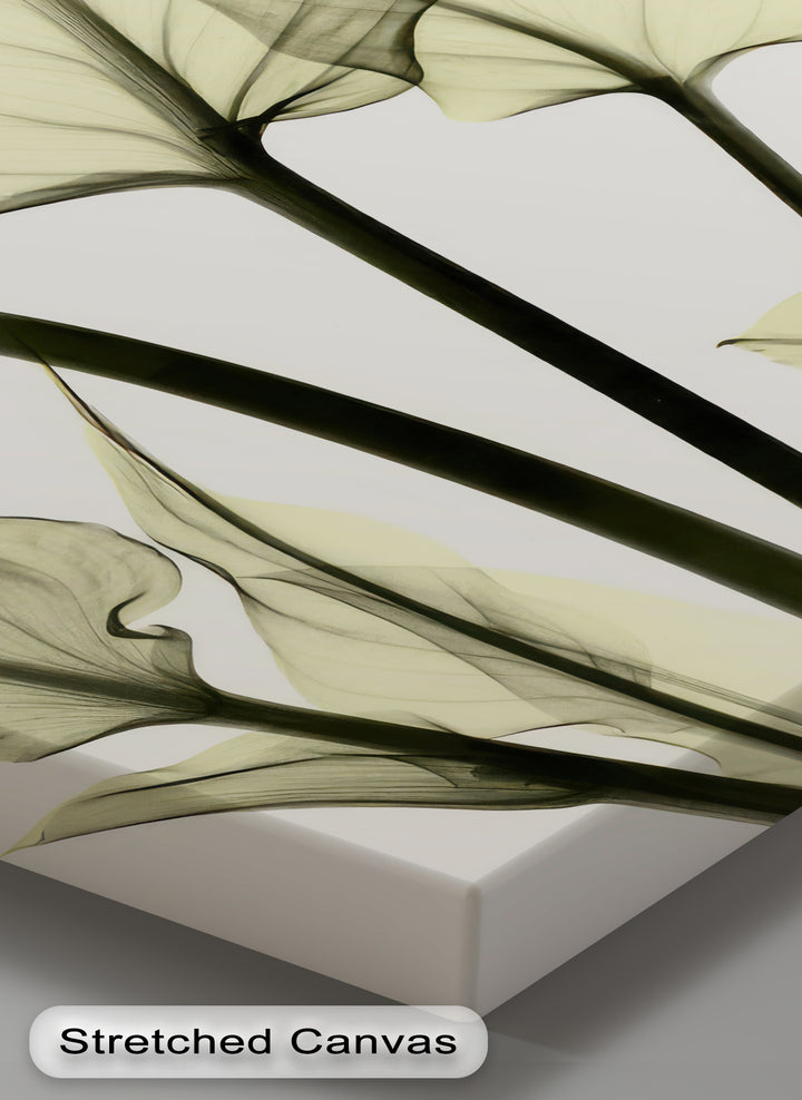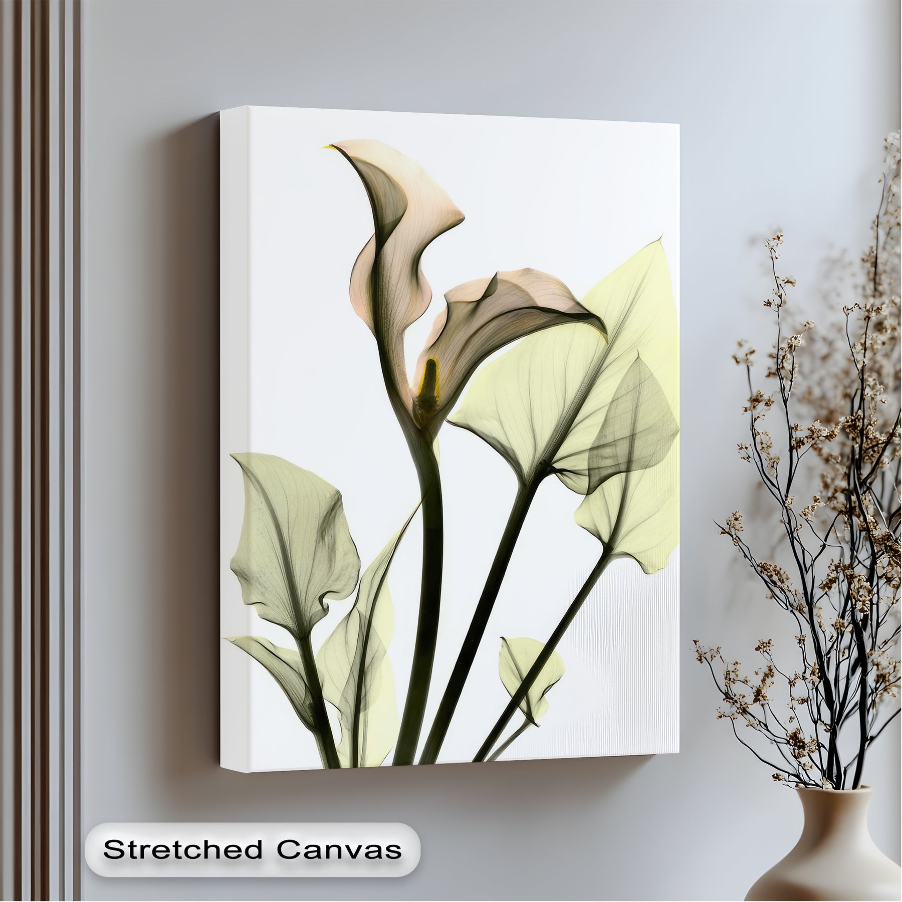 Ethereal and quietly sophisticated, Soft Calla Grace – Minimalist Botanical Canvas Print presents a refined interpretation of calla lilies through translucent layers and gentle, flowing forms. The petals rise with elegant movement, rendered in soft ivory, pale green, and muted golden tones that feel almost weightless against the white background. Each stem curves naturally, creating a serene rhythm that brings calm and balance into the space.