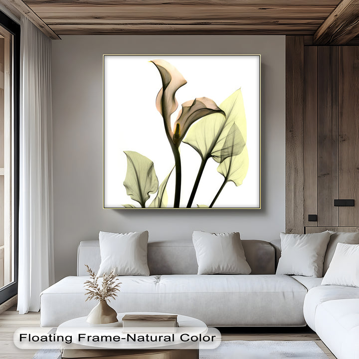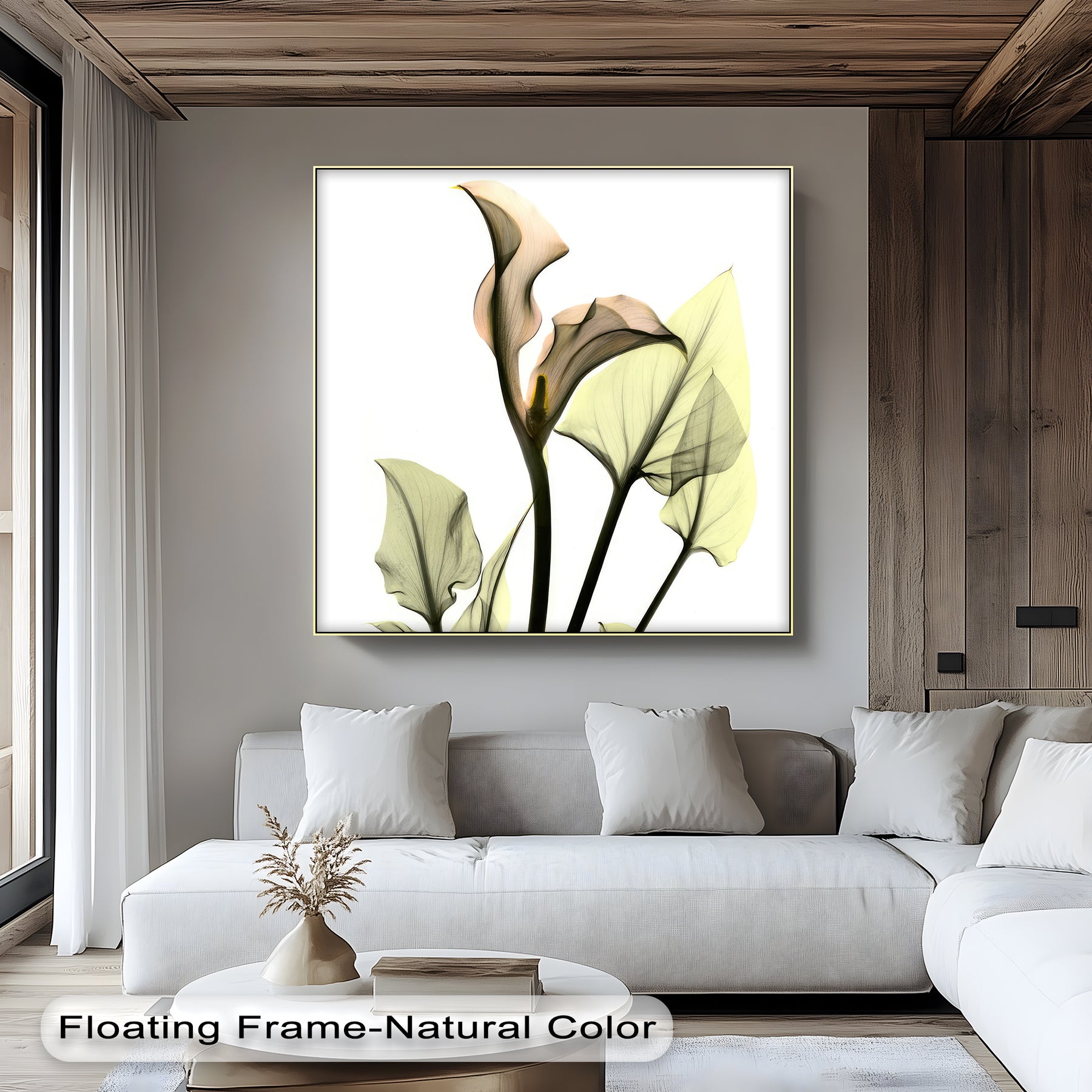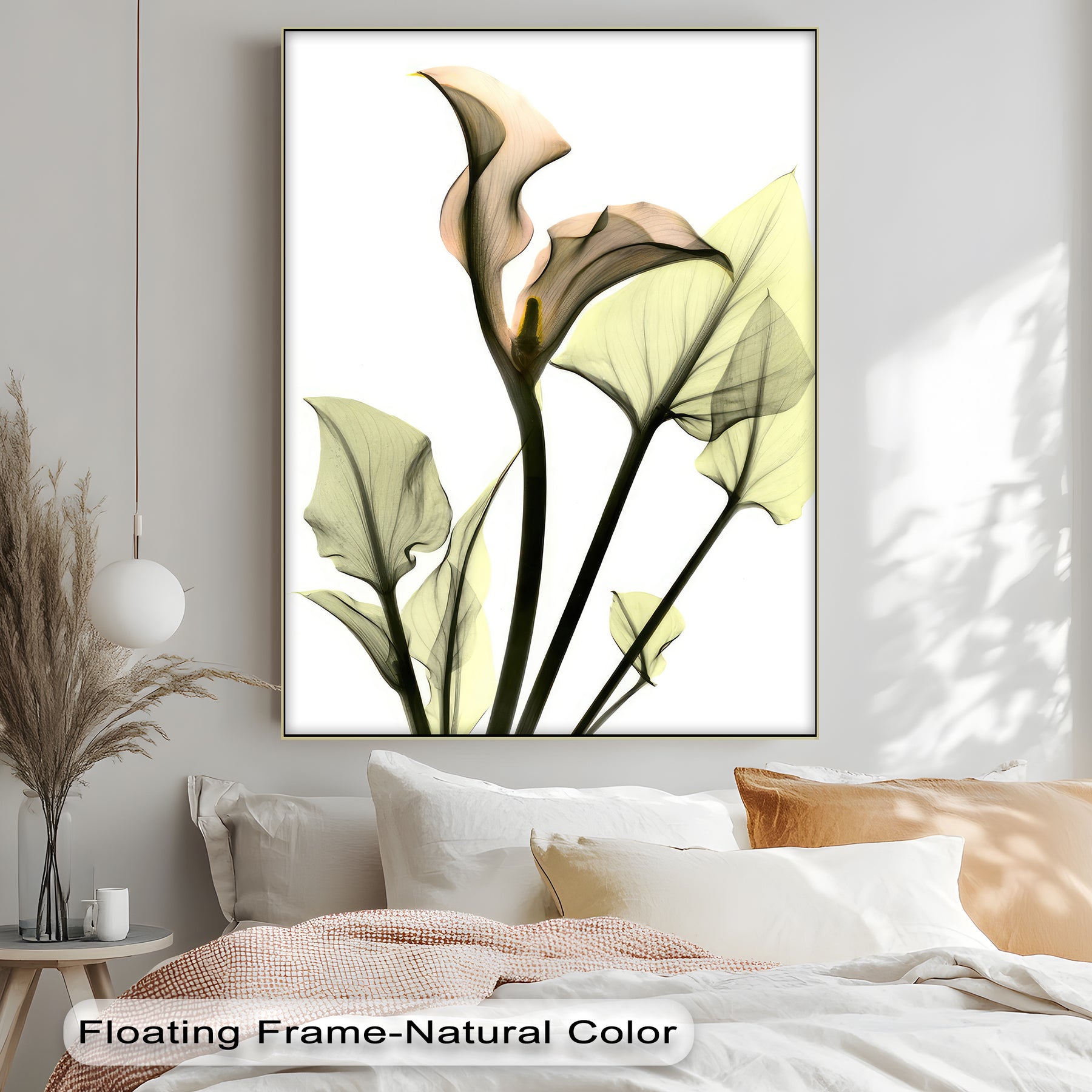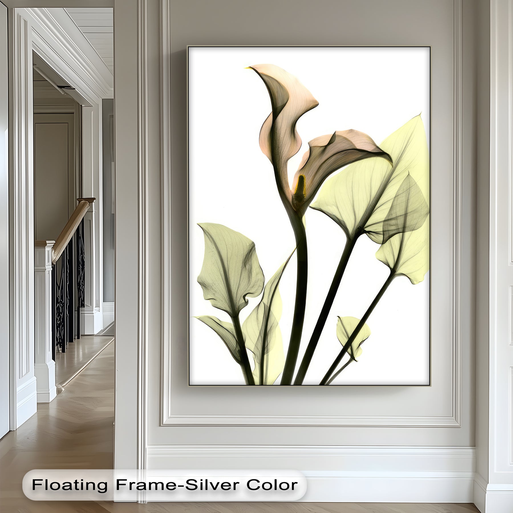 Ethereal and quietly sophisticated, Soft Calla Grace – Minimalist Botanical Canvas Print presents a refined interpretation of calla lilies through translucent layers and gentle, flowing forms. The petals rise with elegant movement, rendered in soft ivory, pale green, and muted golden tones that feel almost weightless against the white background. Each stem curves naturally, creating a serene rhythm that brings calm and balance into the space.