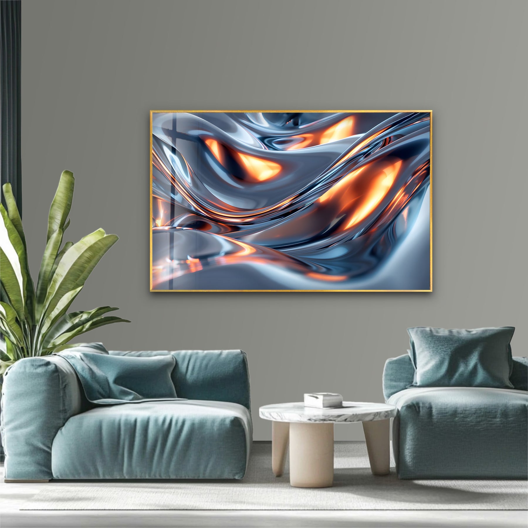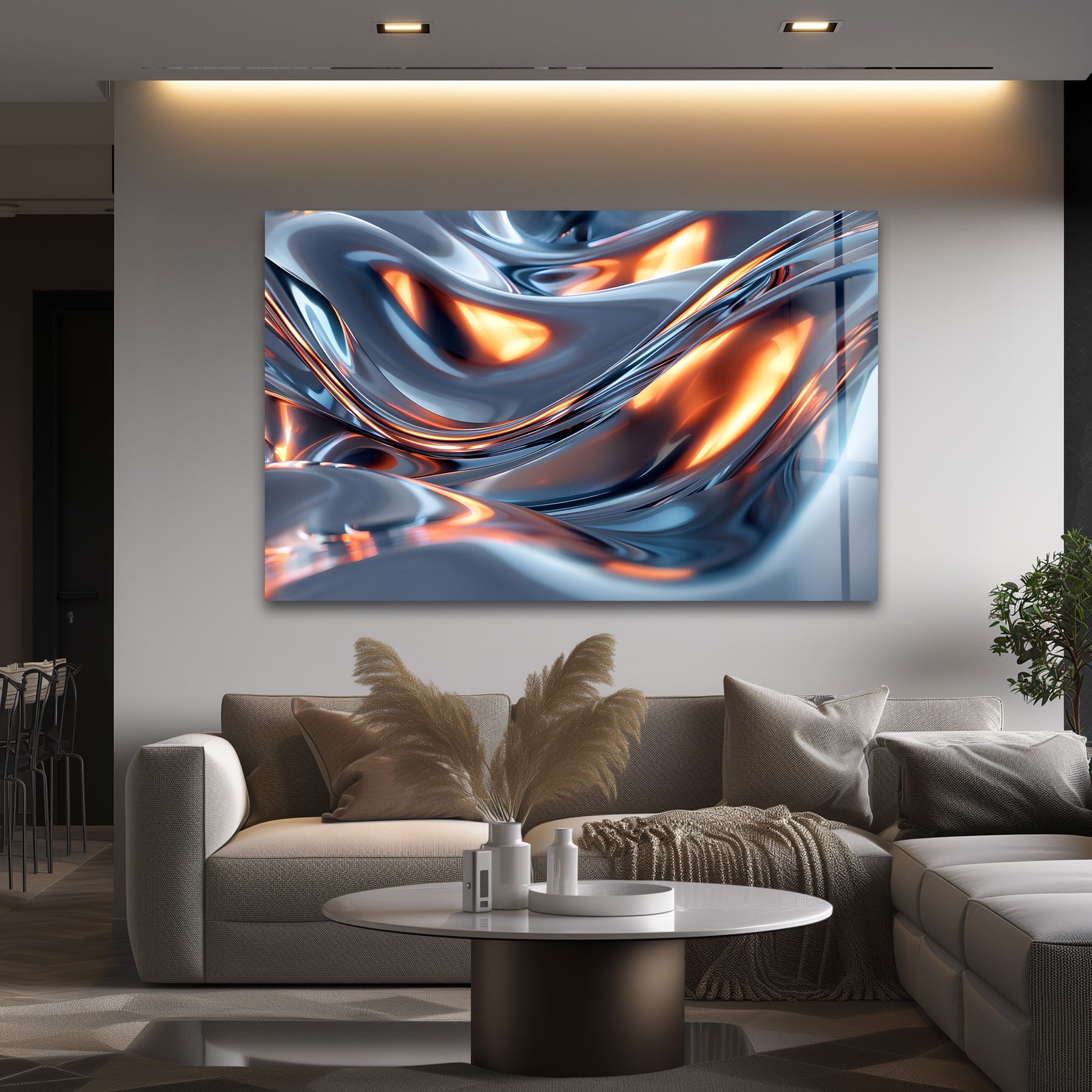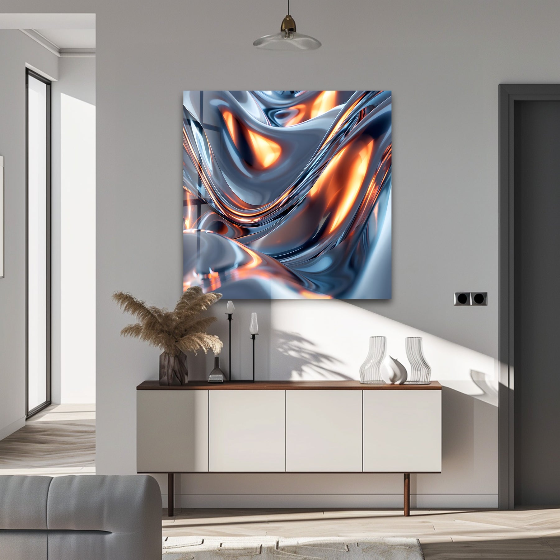 Add bold metallic energy and radiant warmth to your interior with Solar Chrome Surge – Abstract Silver & Ember Flow Glass Wall Art. This captivating artwork blends fluid silver chrome waves with glowing ember-orange highlights, creating the illusion of molten metal illuminated from within. The smooth, sculptural curves deliver a futuristic, high-impact aesthetic—perfect for modern, luxurious, and contemporary décor themes.
