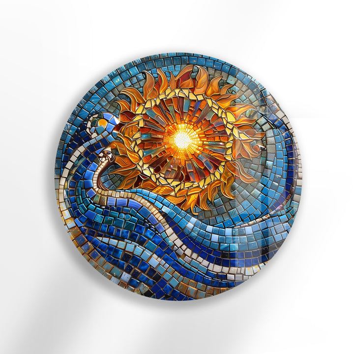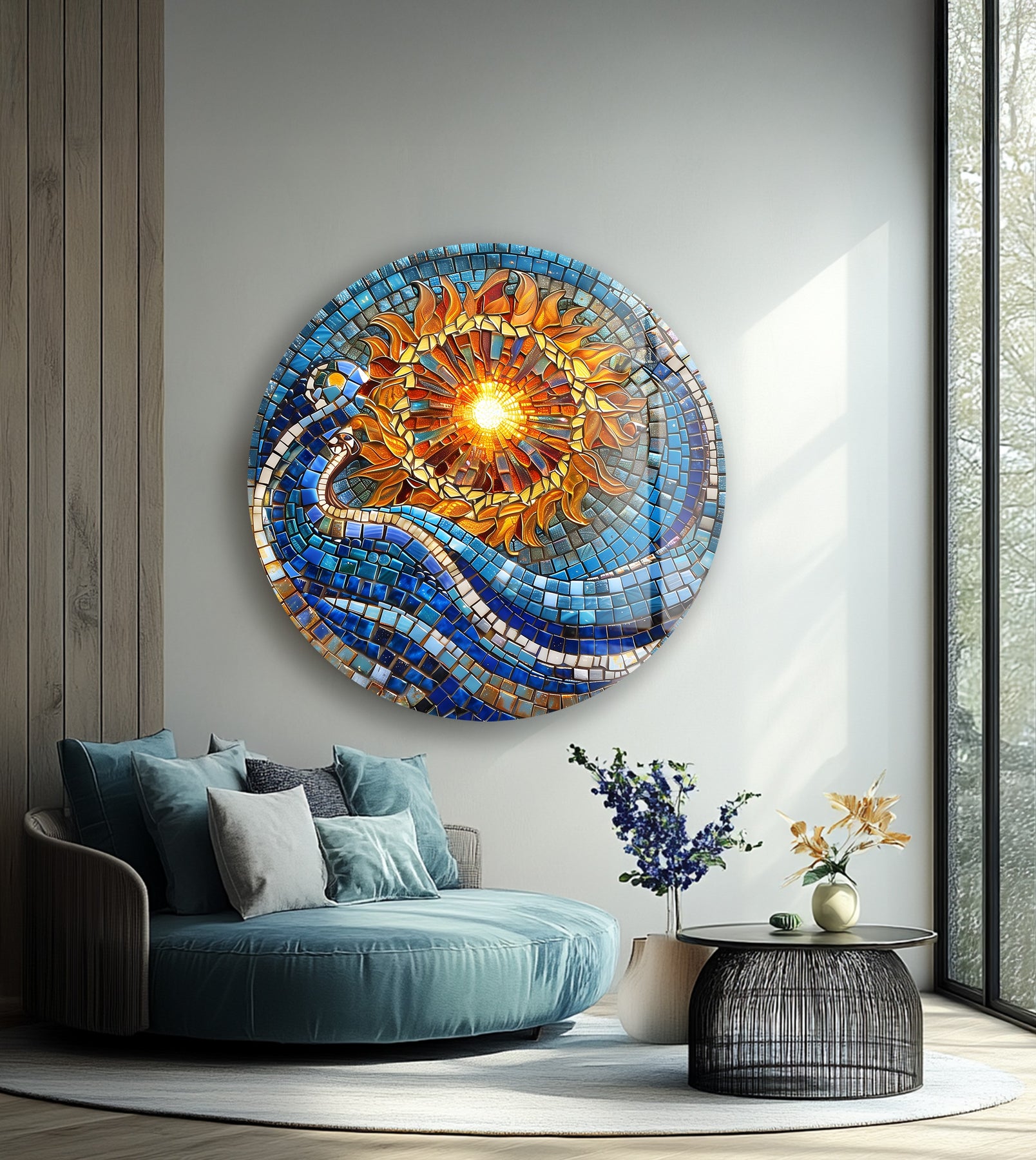 Bring warmth and movement into your home with the Solar Flow – Blue and Gold Mosaic Round Glass Wall Art. This captivating design features a glowing golden sun radiating over flowing waves of deep ocean blues, all composed of intricate mosaic tiles that shimmer beautifully under light. The blend of fiery warmth and tranquil cool tones creates a stunning visual balance, evoking both energy and peace.