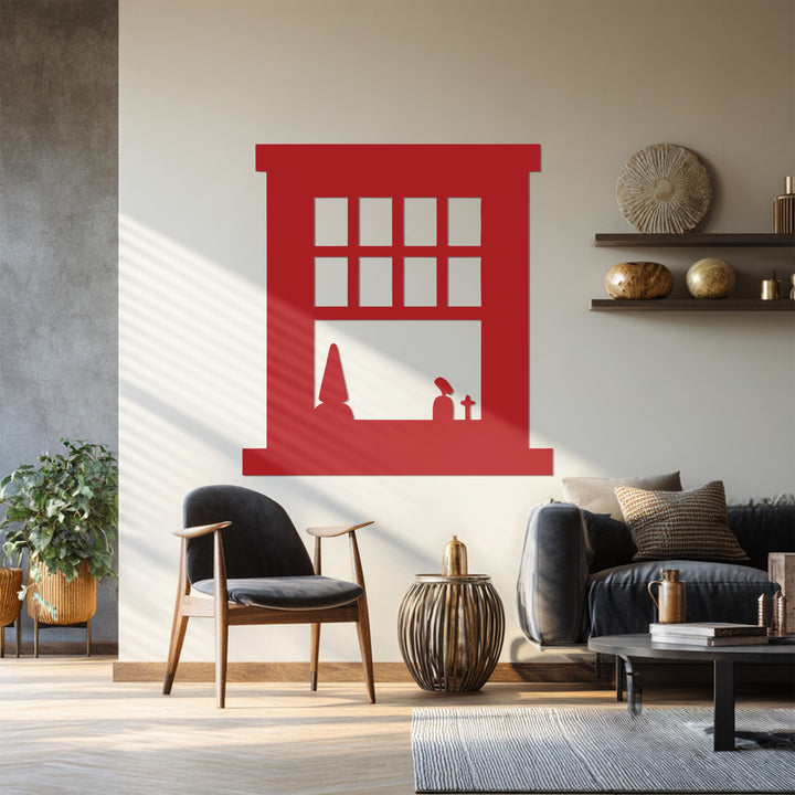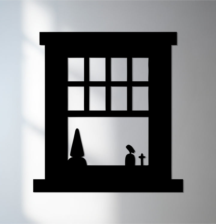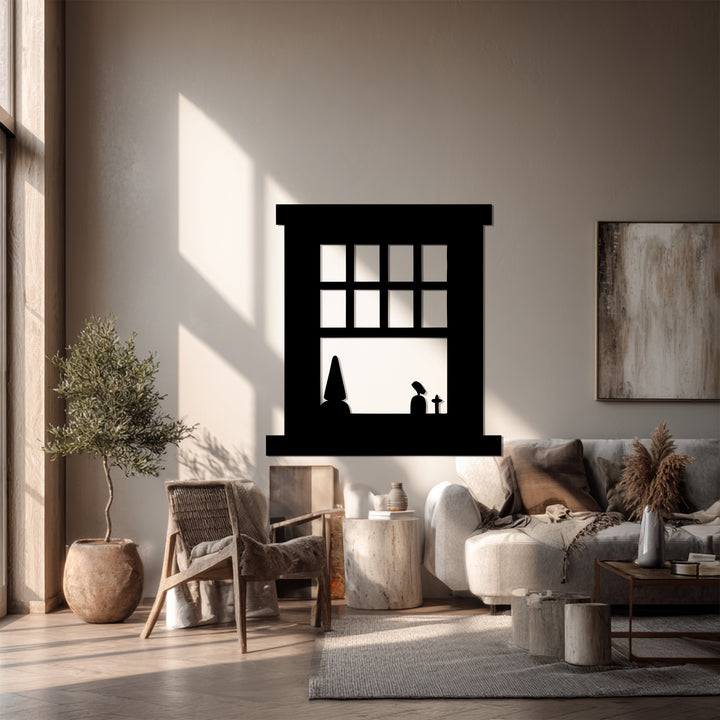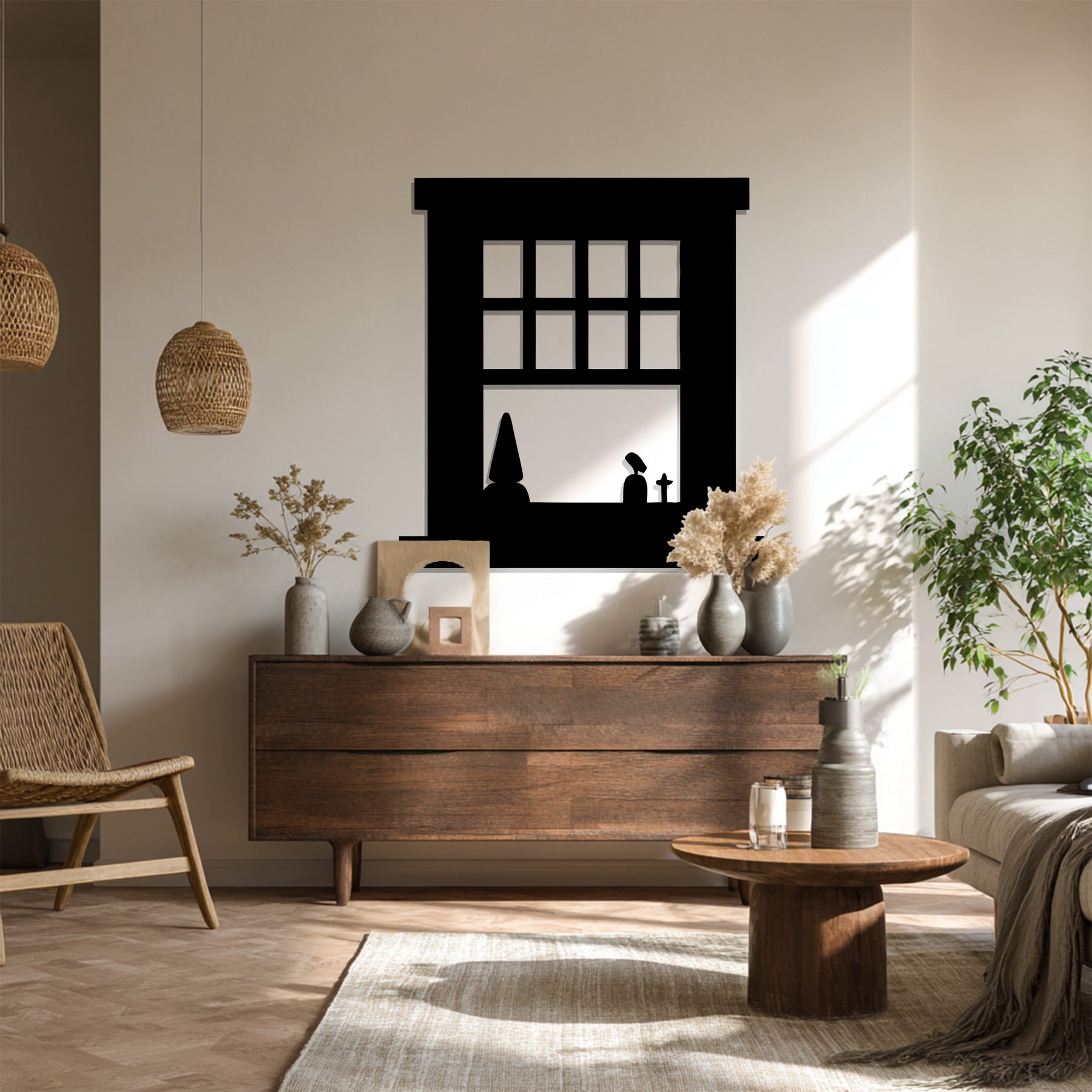 Transform your walls with the refined elegance of this square grid window silhouette metal wall art. Featuring a classic six-pane window design with charming details like a small tree, decorative bottle, and a minimal cross accent, this piece creates the warm, inviting atmosphere of a thoughtfully decorated home.