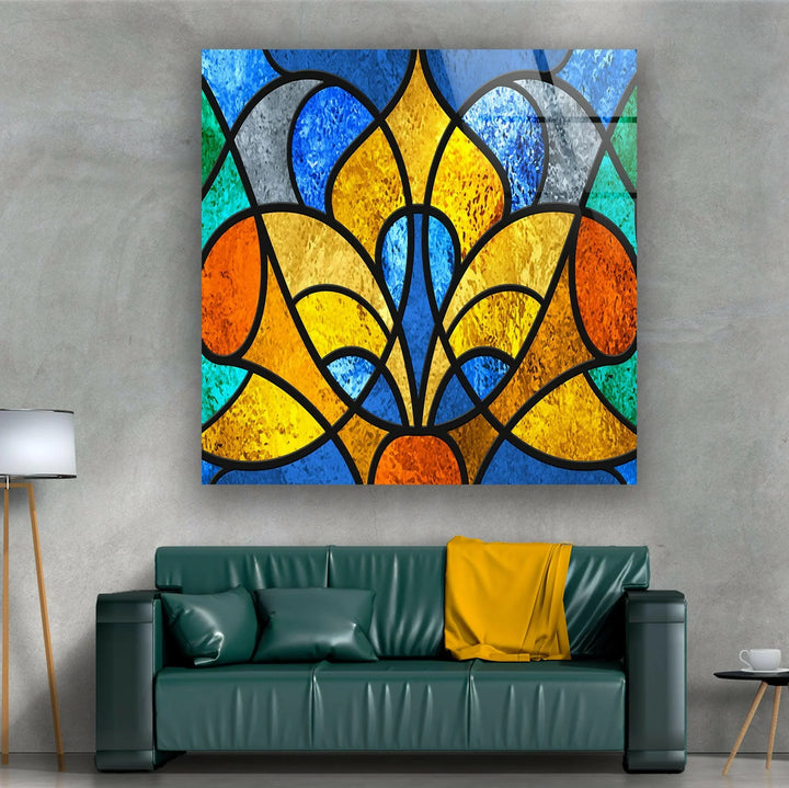 Enhance your space with the intricate beauty of this Stained Abstract stained glass wall decor. This unique Glass Wall Art piece features an elegant Art Deco-inspired design in rich hues of blue, orange, and yellow. The bold shapes and colors bring a sense of warmth and sophistication, transforming any room into an artful sanctuary.