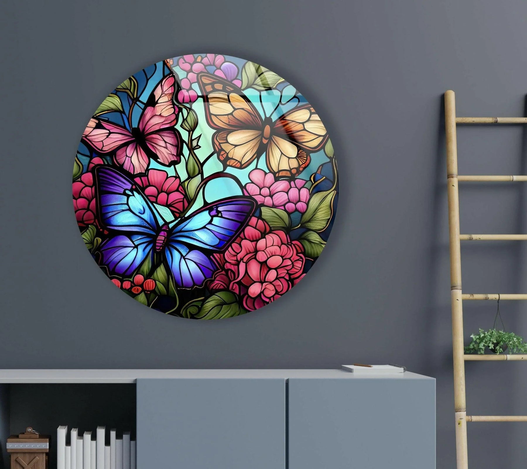 Bring the beauty of nature into your home with the Stained Colored Butterflies Round wall decor. This exquisite artwork features vivid butterflies and floral designs that radiate life and elegance. Its intricate detailing and brilliant colors make it a captivating focal point for any space.