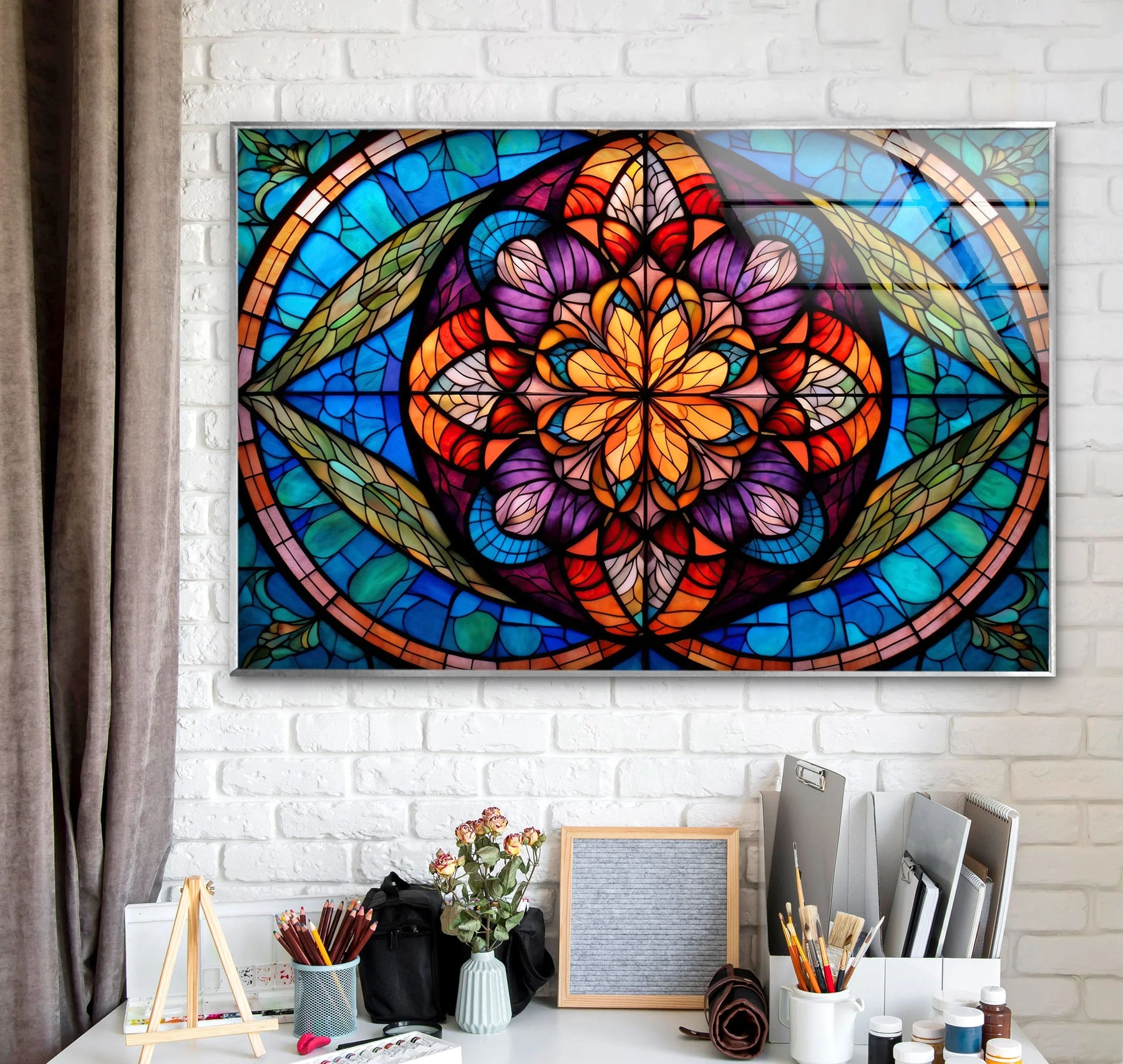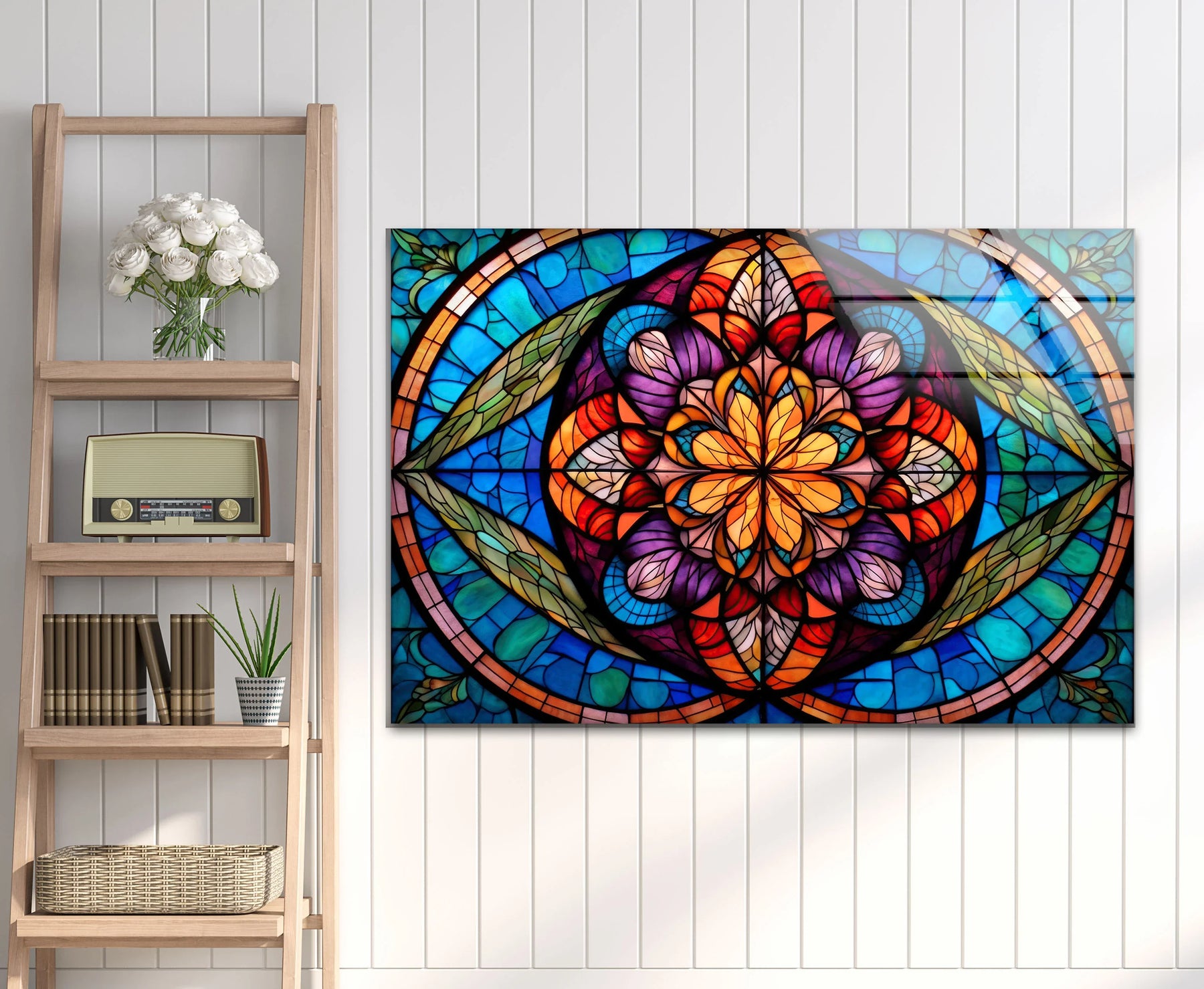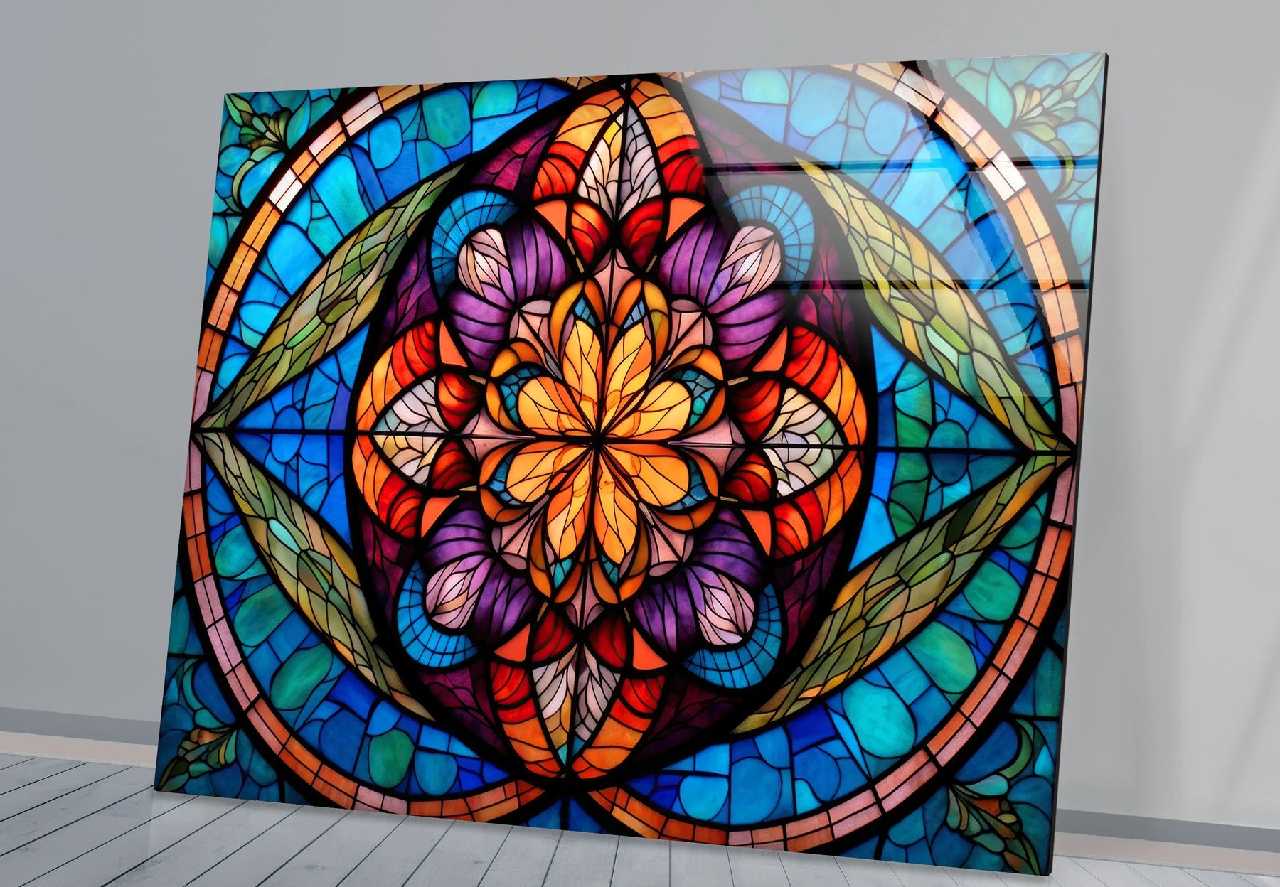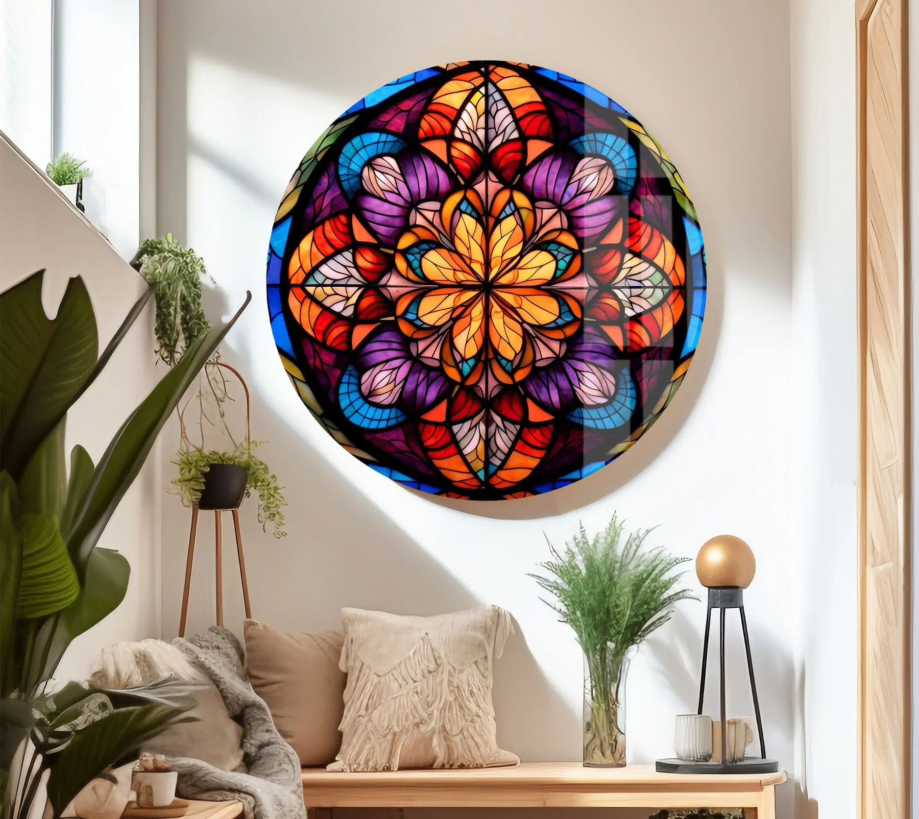 Stained Glass Mandala Wall Art – Colorful Symmetrical Glass Print for Boho, Spiritual, or Artistic Interiors