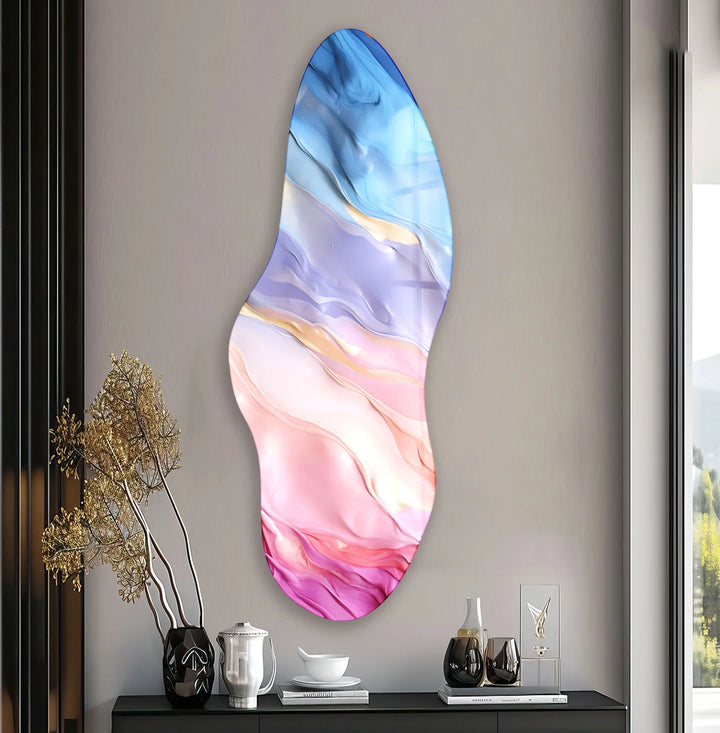 Transform your space with the enchanting beauty of the Stylish Pink Abstract Irregular large abstract art and Glass Wall Art. This exquisite piece showcases soft pink, pastel blue, and creamy hues blending seamlessly, creating a mesmerizing and elegant aesthetic. Its irregular shape adds a contemporary edge, making it a statement piece for any room.