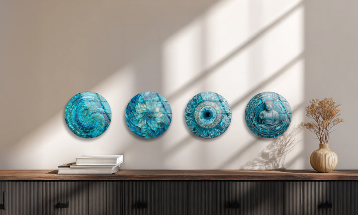 Crafted on tempered glass for a glossy, high-definition finish, each piece radiates tranquility and elegance. The rich shades of sapphire, turquoise, and aqua evoke the soothing energy of water and sky — ideal for meditation rooms, living spaces, or modern interiors seeking spiritual sophistication.