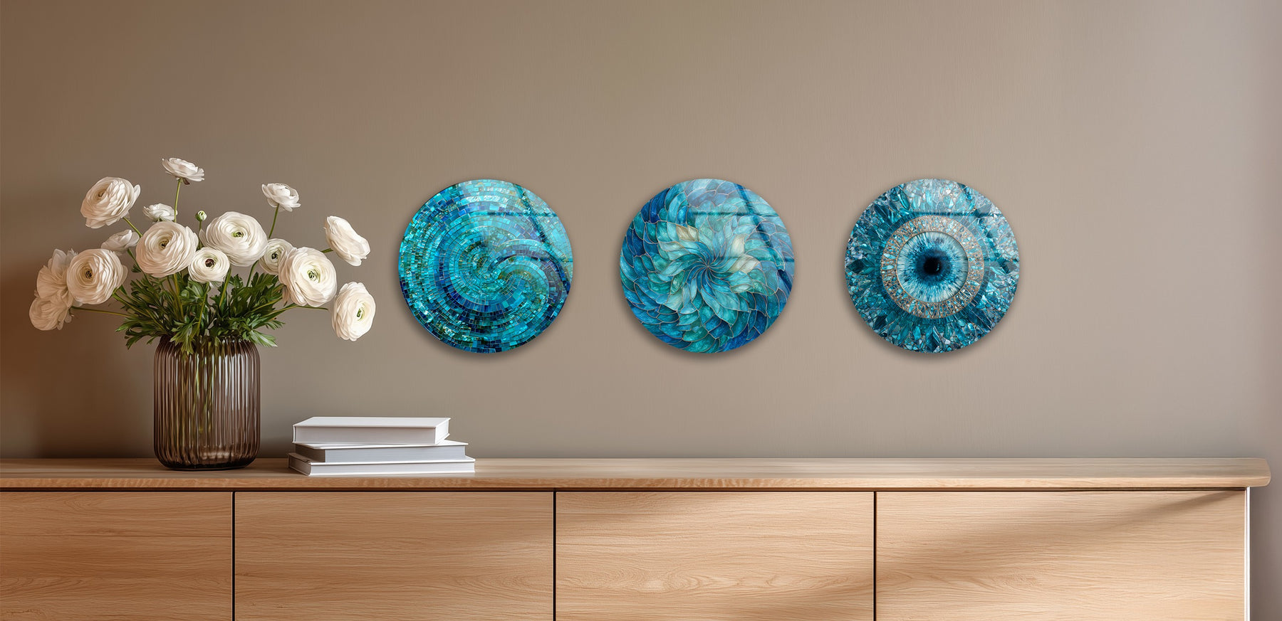 Invite calm and harmony into your home with the Tranquil Reflections Trio – Blue Mosaic & Buddha Round Glass Wall Art Set. This serene collection features a meditative Buddha, a mosaic eye of enlightenment, and an abstract swirl of oceanic blues. Together, they create a visual symphony of balance, mindfulness, and inner peace.