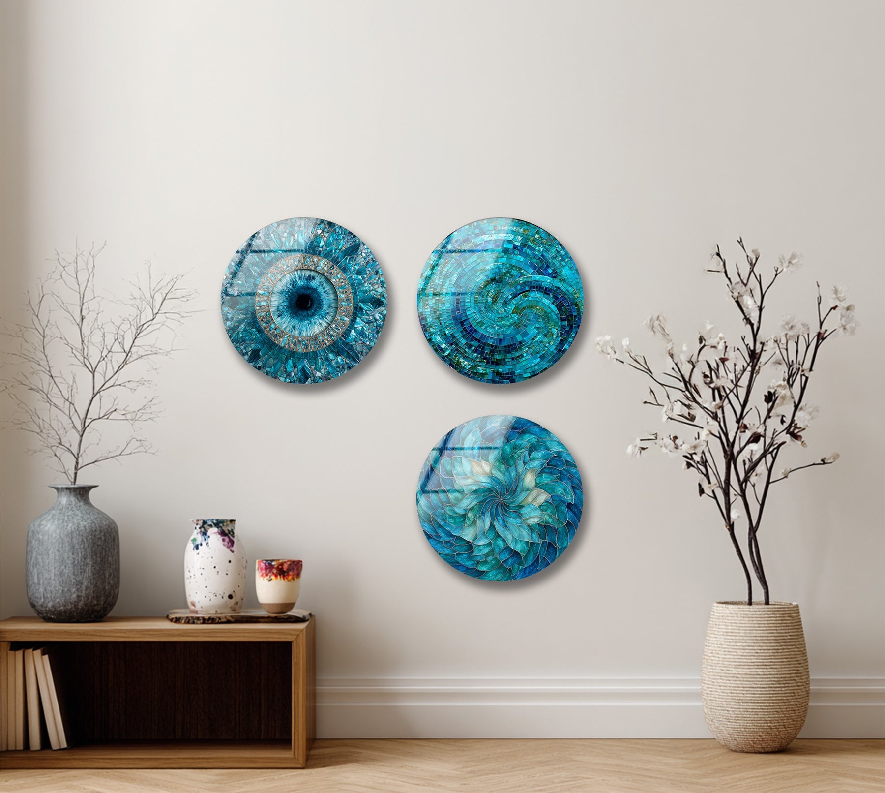 Tranquil Reflections Trio – Blue Mosaic & Buddha Round Glass Wall Art Set