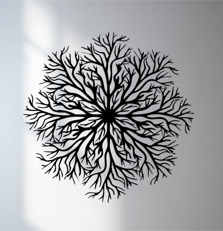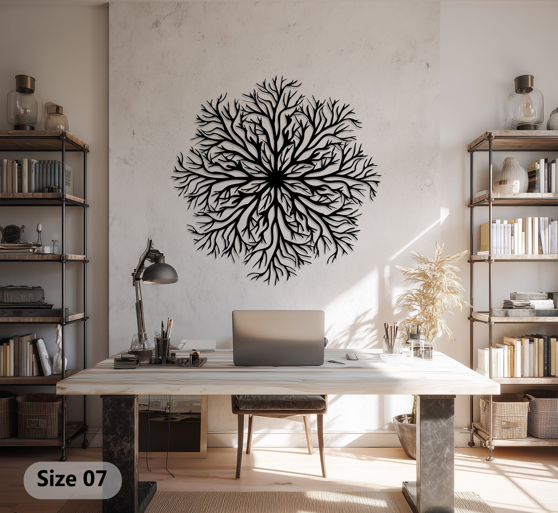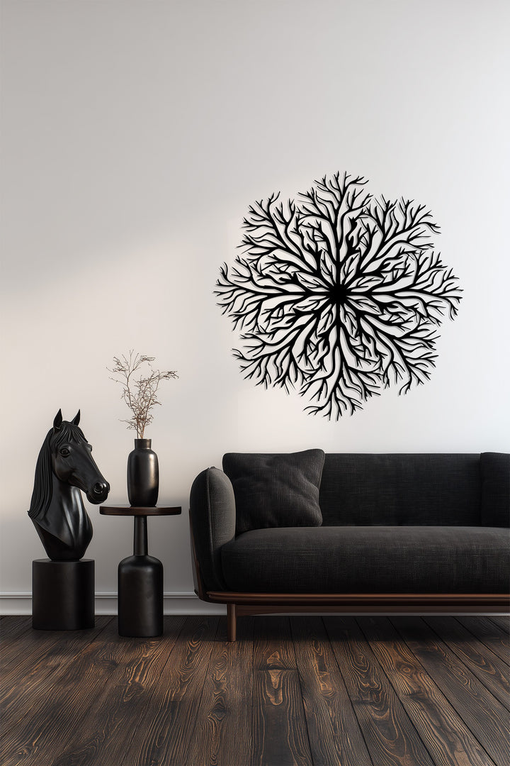 The bold black metal finish makes it a striking focal point, whether displayed in your living room, bedroom, hallway, or office. Its circular mandala form radiates harmony, while the branching tree patterns embody renewal, resilience, and the eternal cycle of life.
