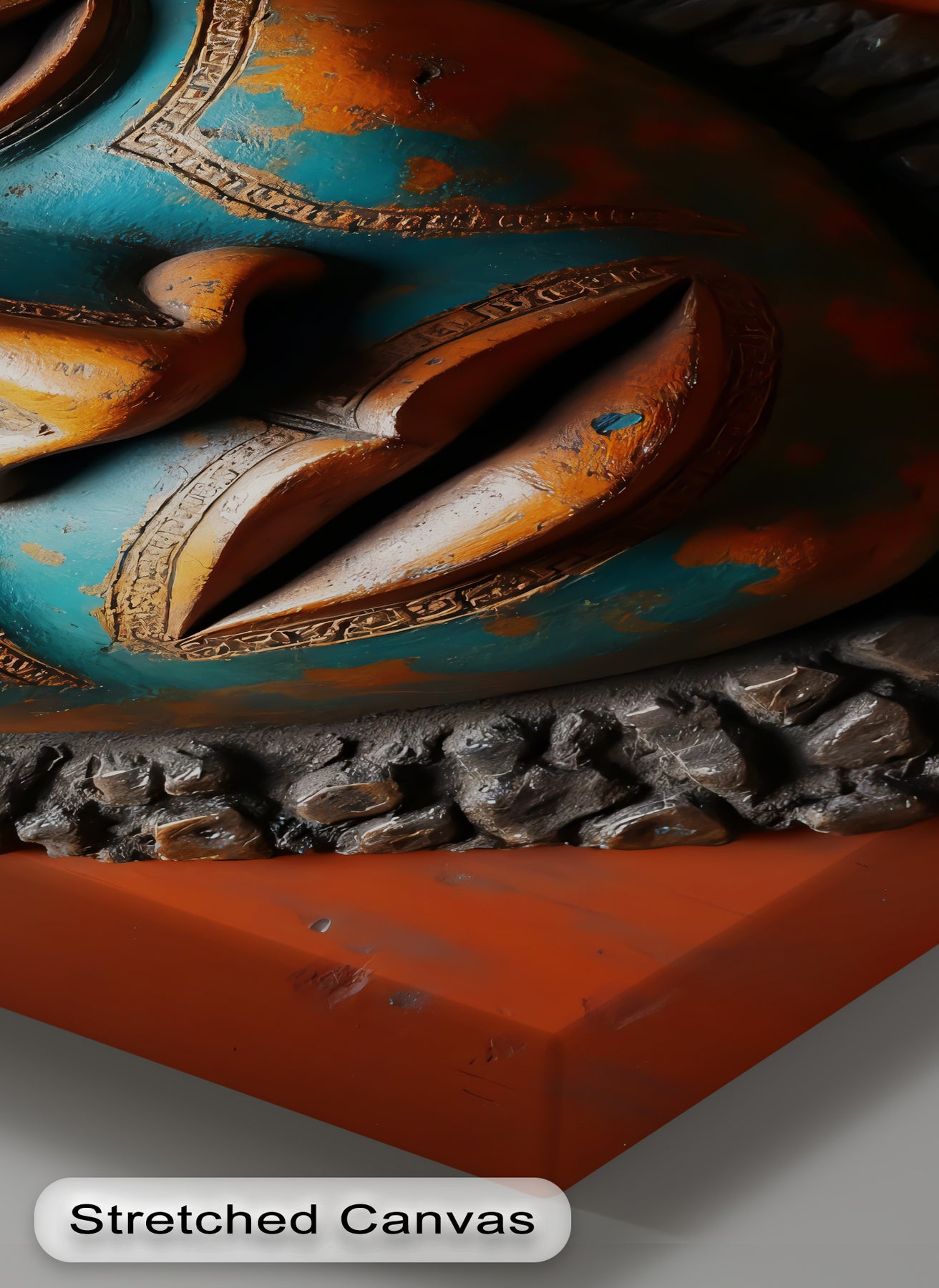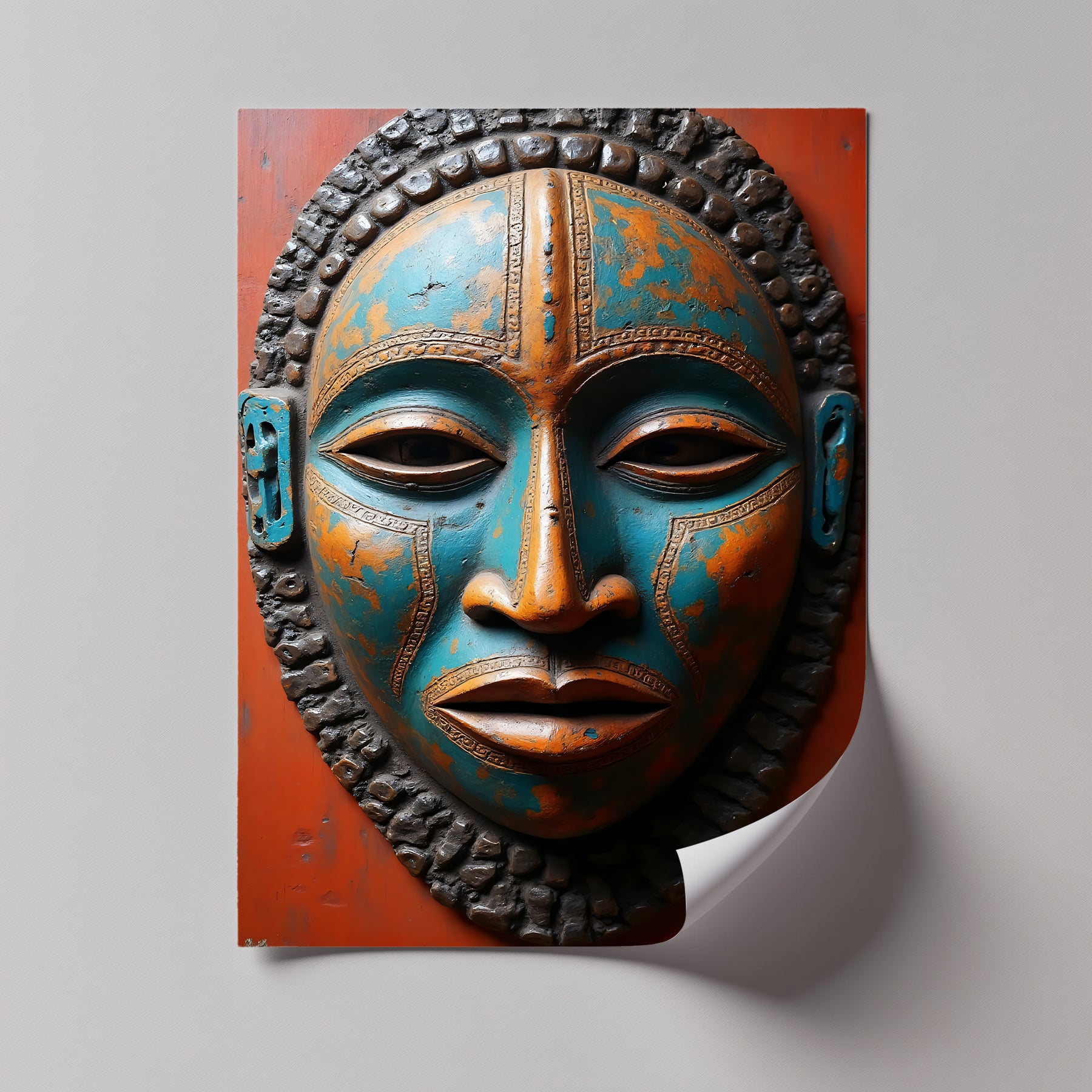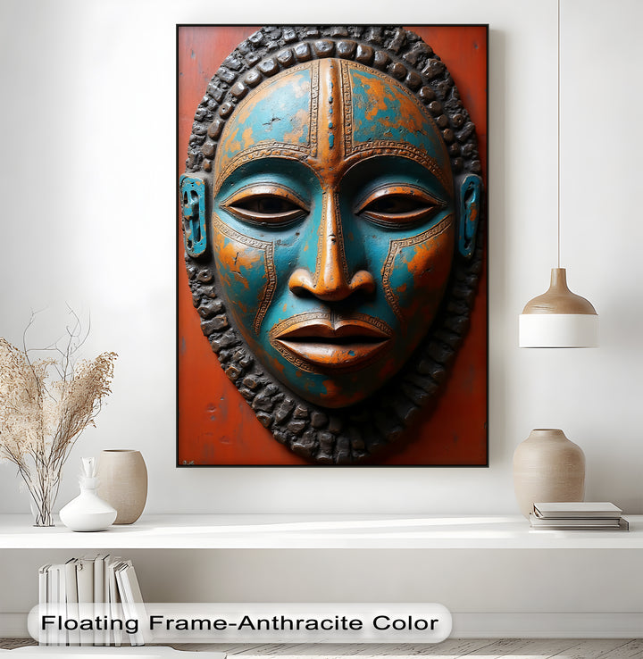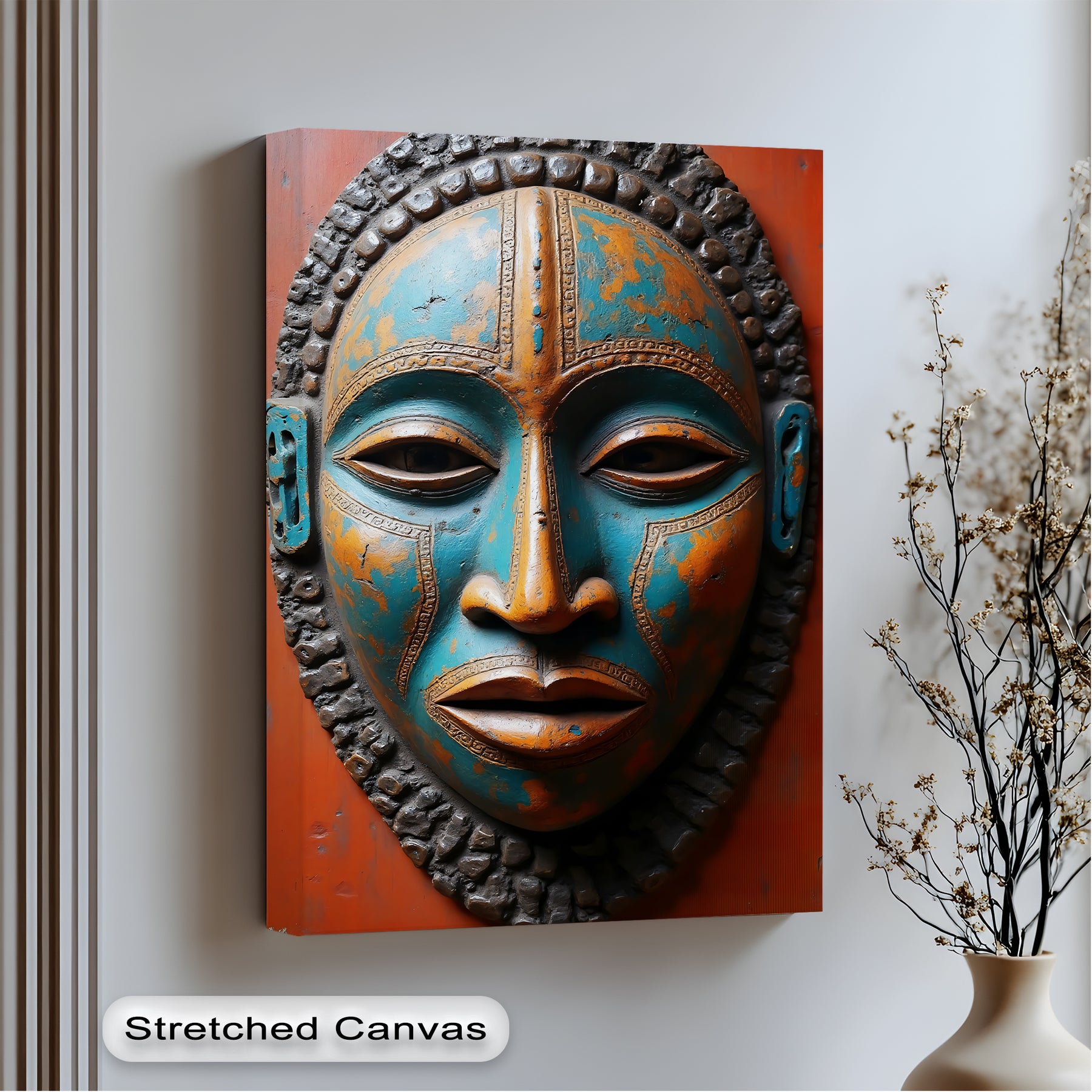 Celebrate the richness of African heritage with Tribal Guardian, a mesmerizing African mask canvas wall art that embodies mystery, tradition, and cultural pride. With deep shades of turquoise blue and earthy copper tones, the mask is adorned with intricate carvings and textured details that speak of ancient rituals and spiritual protection.