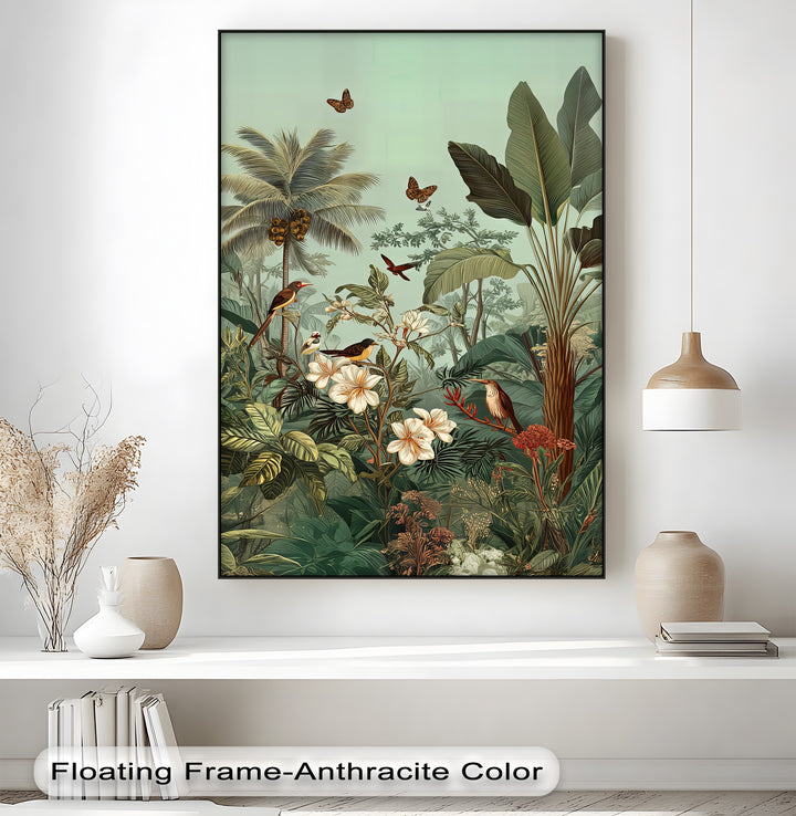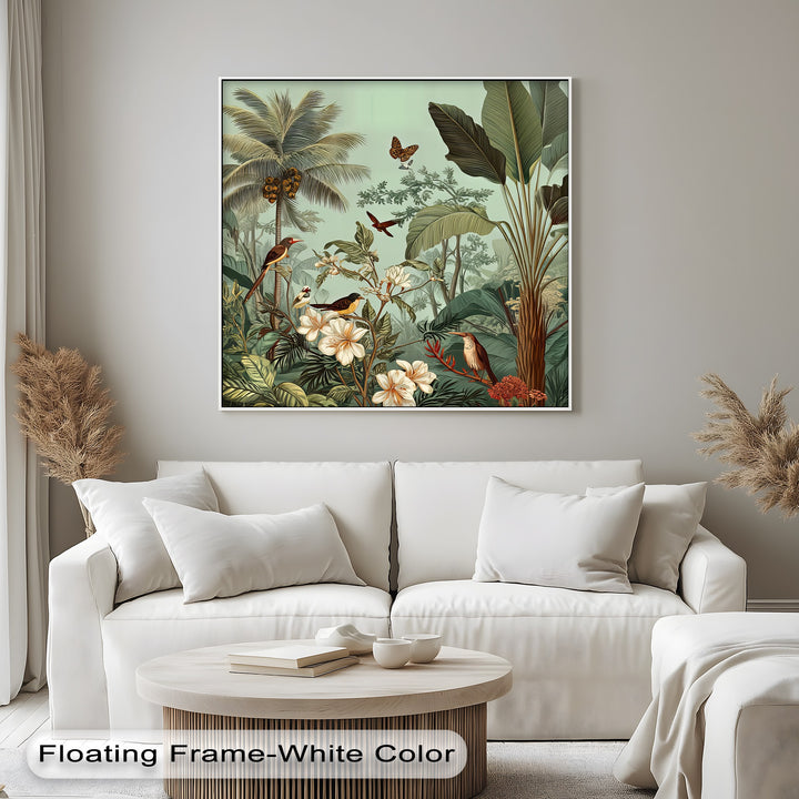 The soft green backdrop evokes tranquility, while the intricate details of tropical foliage and wildlife create a striking centerpiece for your space. Perfect as large canvas art or oversized wall décor, this artwork transforms any room into a serene escape infused with natural elegance.