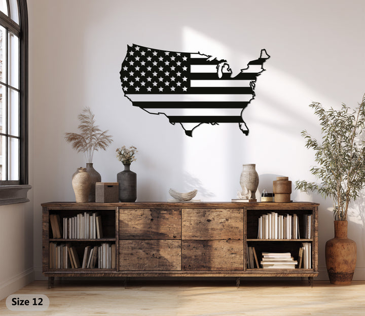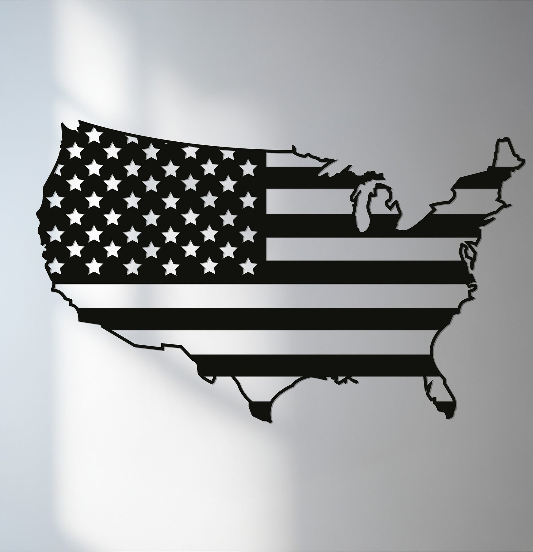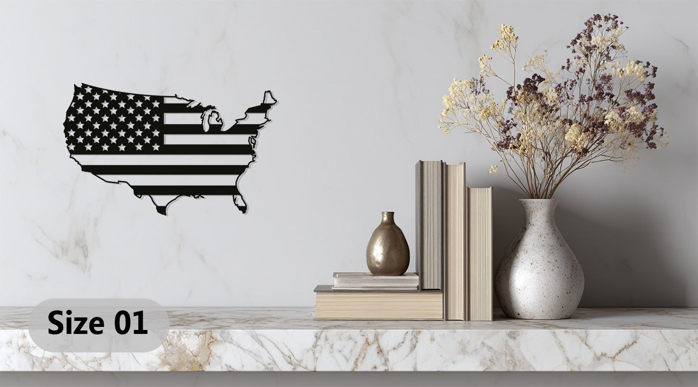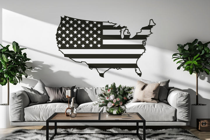 Showcase your pride and style with this USA Map Metal Wall Art, featuring a bold American flag pattern across the country’s silhouette. Designed in sleek black metal, this artwork blends patriotism with modern minimalism, making it an eye-catching wall accent.