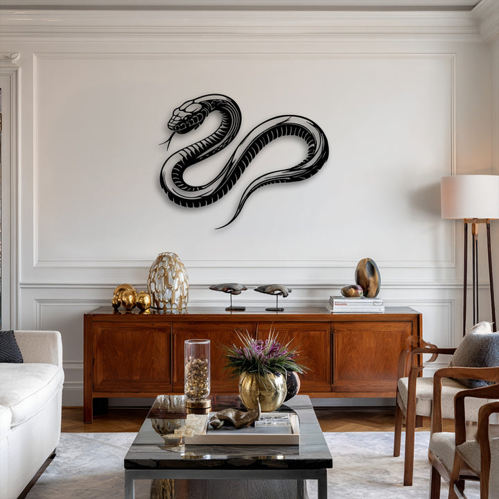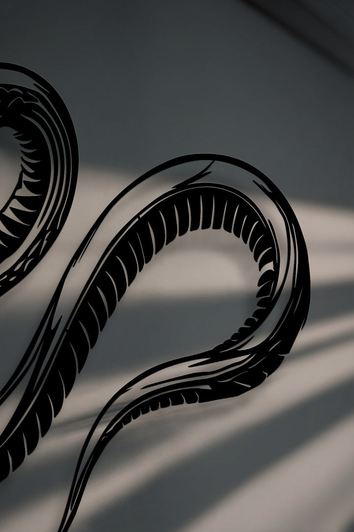 Bring bold energy and primal elegance into your space with this striking snake metal wall art. Designed with flowing curves and sharp detailing, the coiled serpent form captures both movement and intensity, making it a powerful focal point for modern interiors. The sleek black finish enhances its dramatic presence, while the minimalist yet fierce design adds a touch of edgy sophistication to any wall.