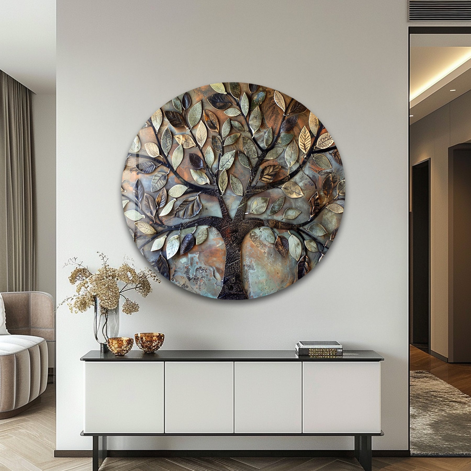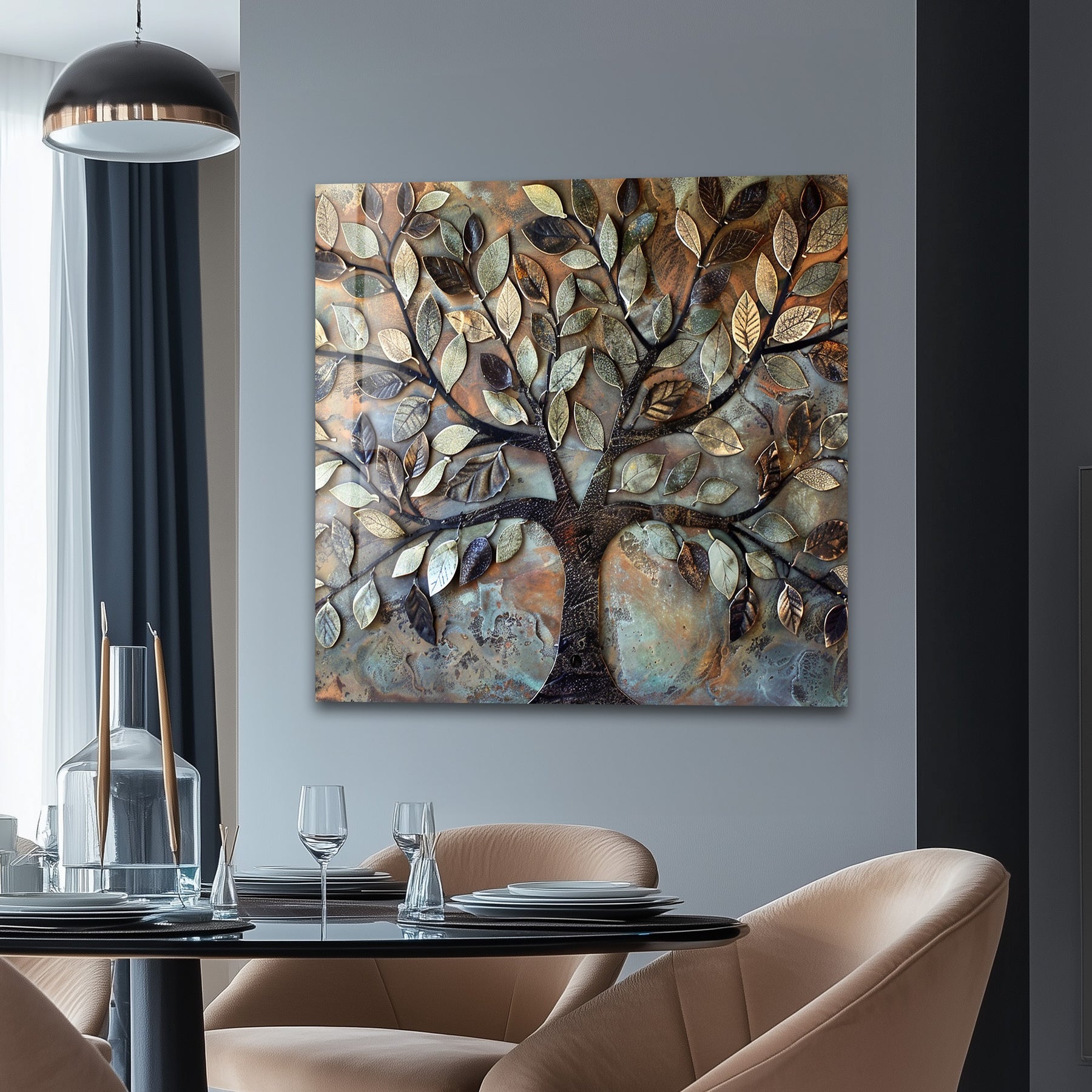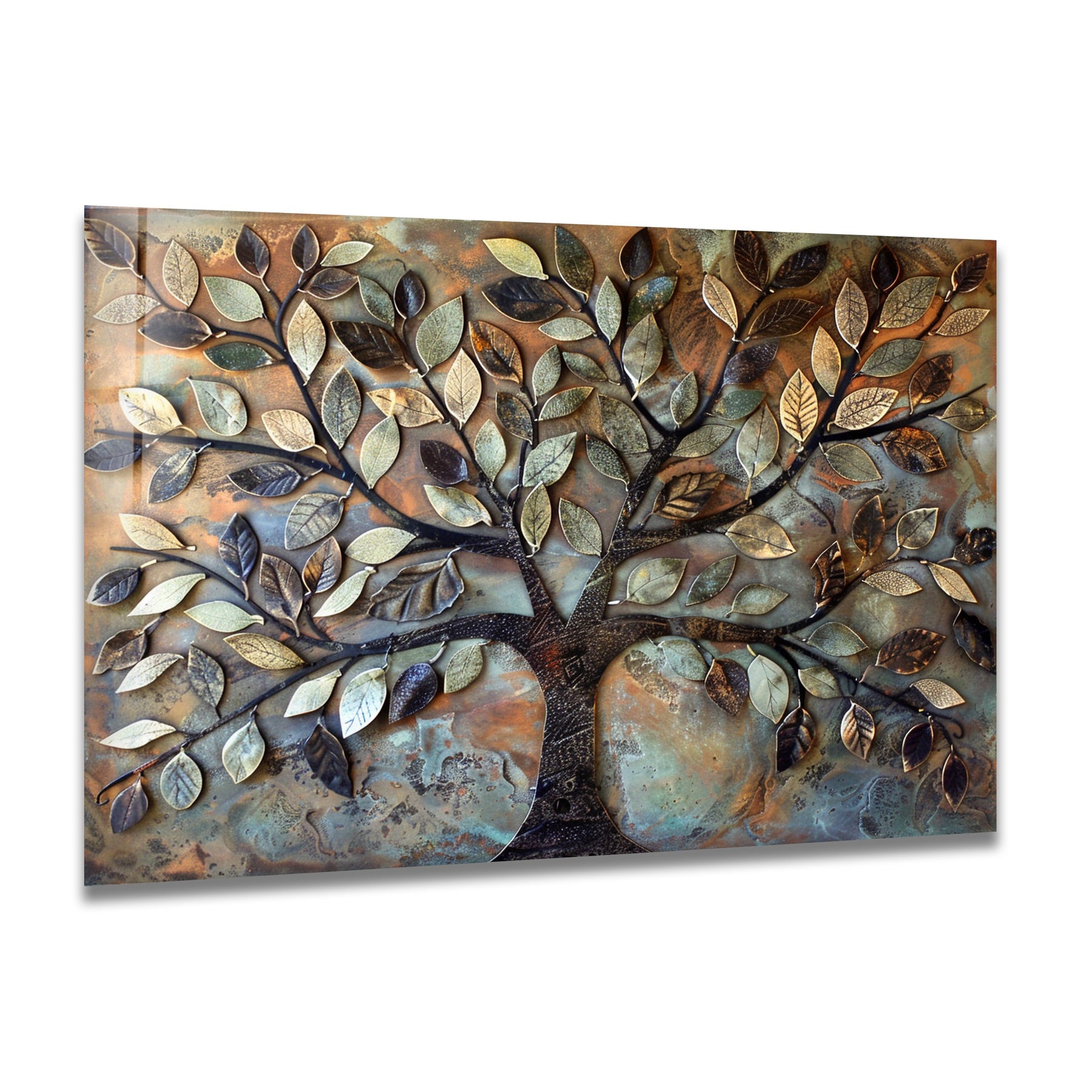 Printed on ultra-gloss premium glass, every leaf contour, textured vein, and metallic highlight appears with exceptional clarity. Ideal for living rooms, bedrooms, hallways, rustic-modern homes, and upscale commercial spaces, this artwork creates a warm, comforting, and timeless atmosphere.