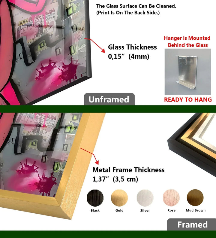 Add a bold and playful touch to your space with the Vibrant Pink Street Art Animation Glass Wall Art. Featuring the iconic Vibrant Pink Street Art character spray-painting over a collage of vibrant comic scenes, this piece bursts with rebellious energy and nostalgic charm. The colorful graffiti-inspired design paired with high-definition glass printing creates a striking, modern centerpiece that's perfect for urban lofts, creative studios, and trendy interiors. Let this cheeky artwork bring humor, creativity, and color into your home or office!