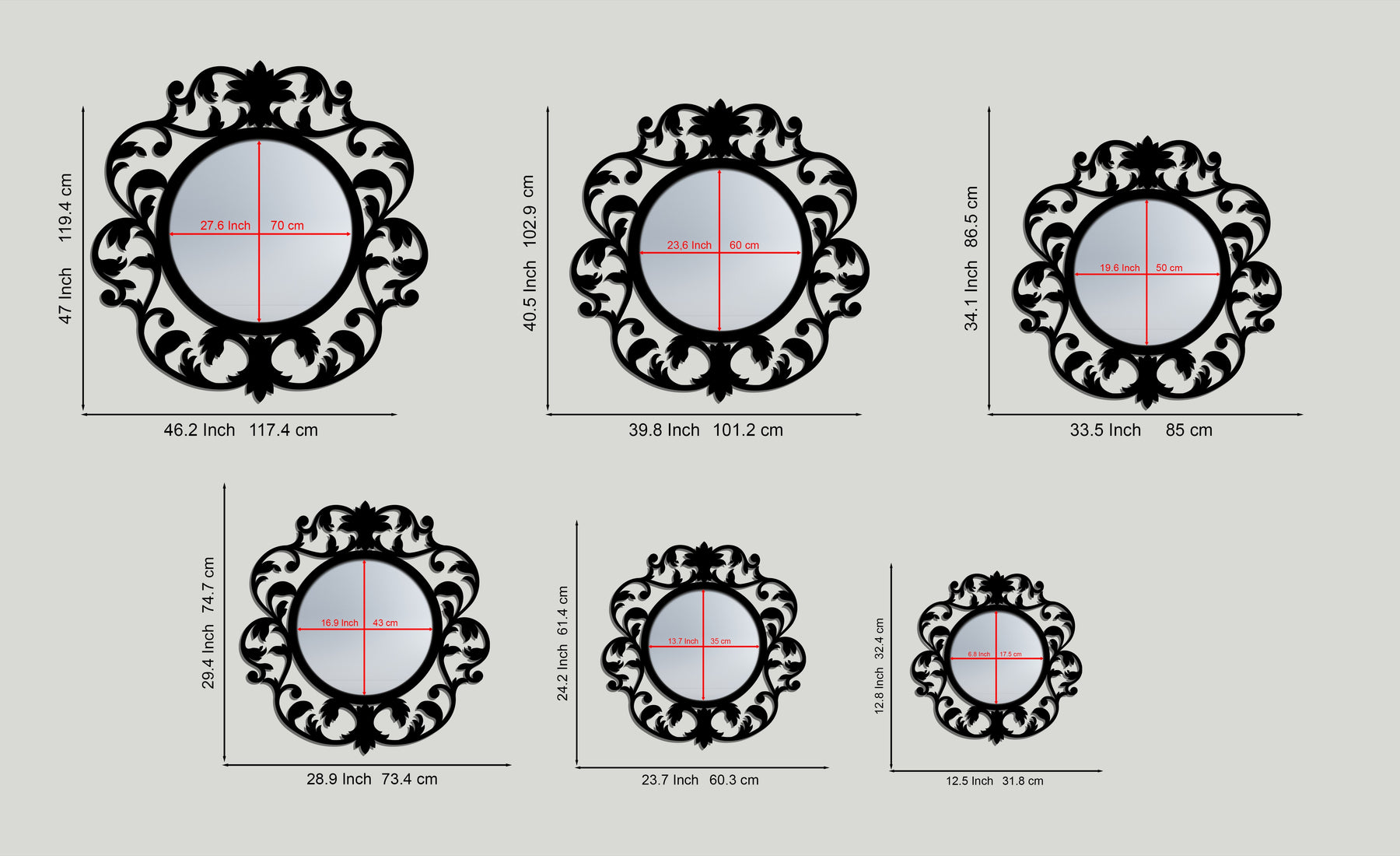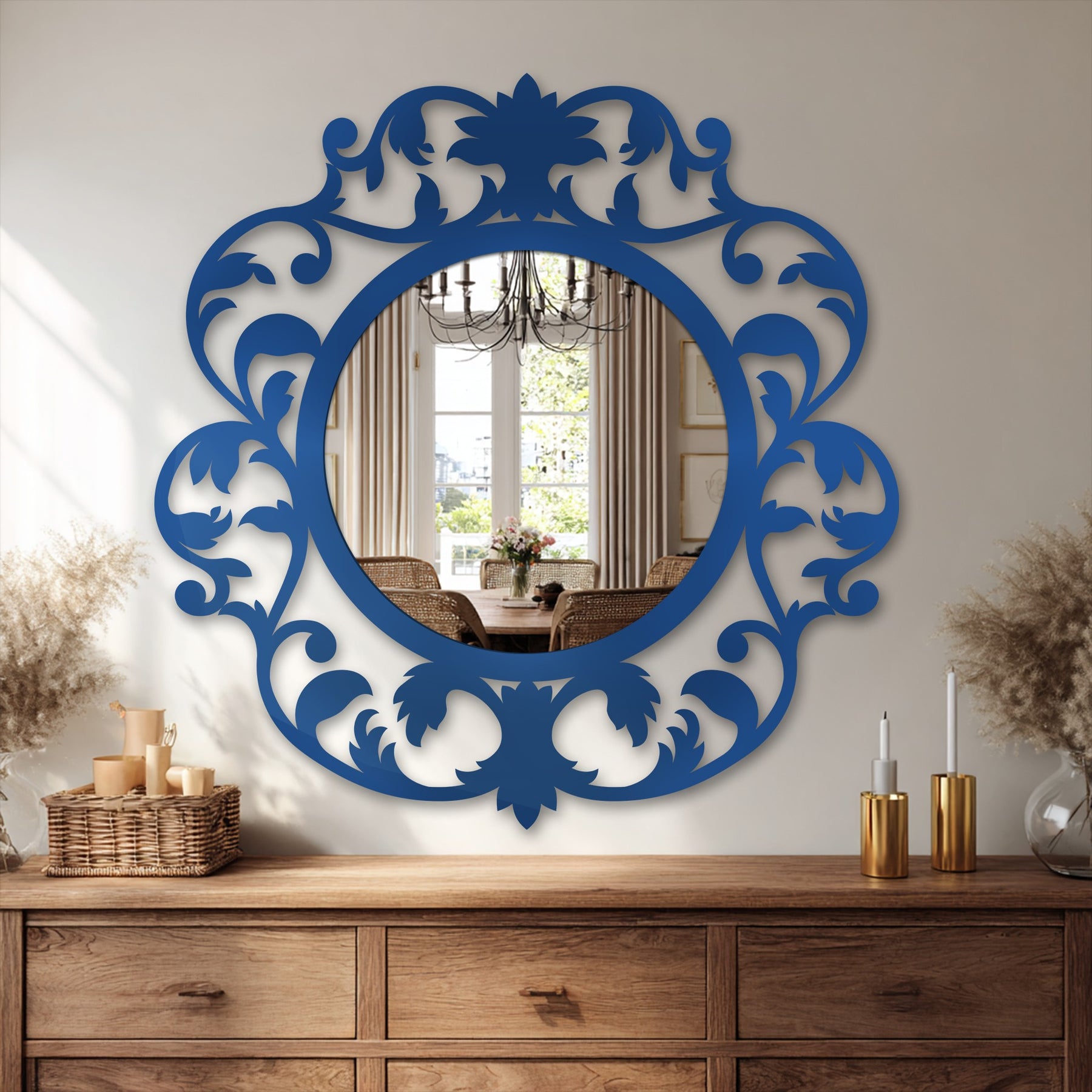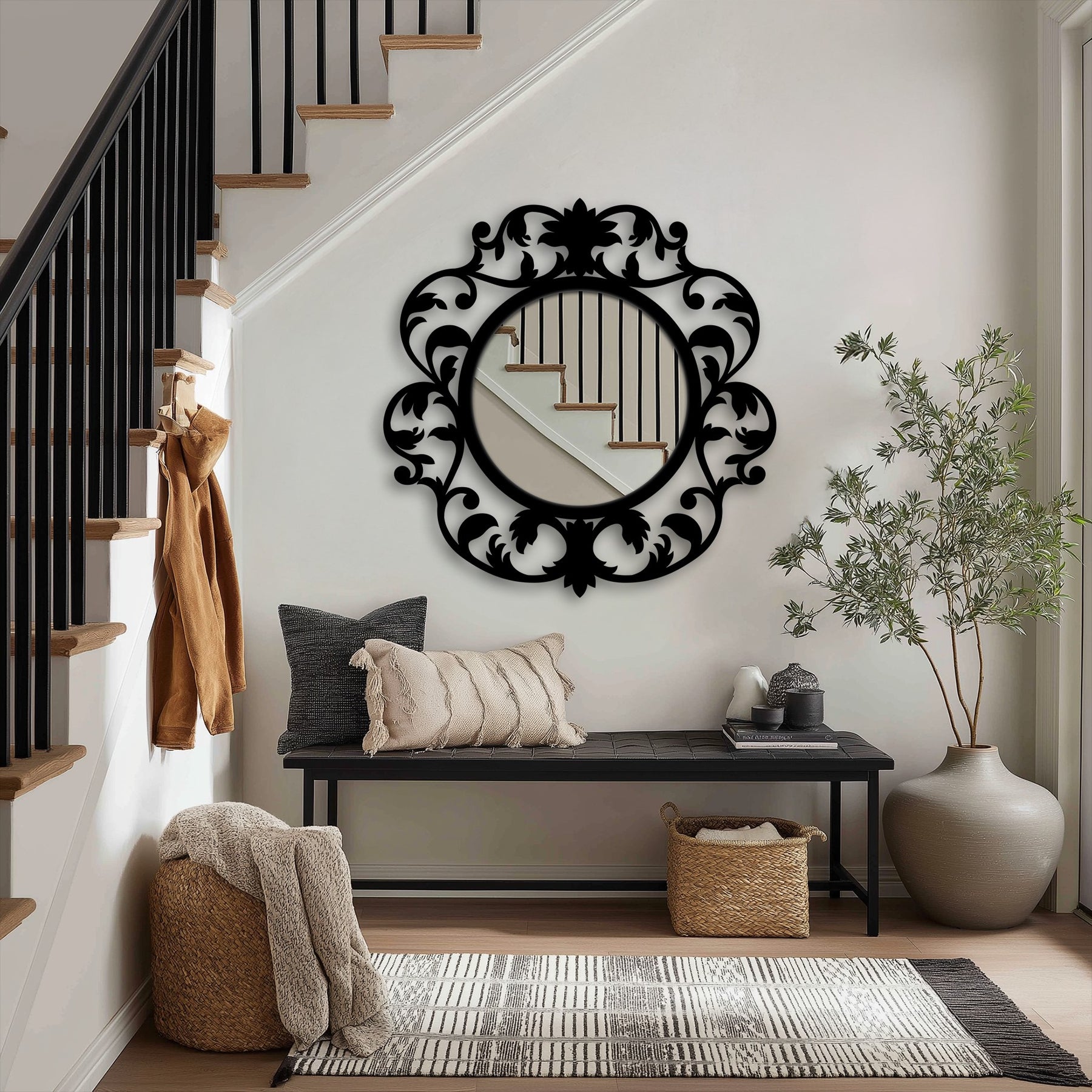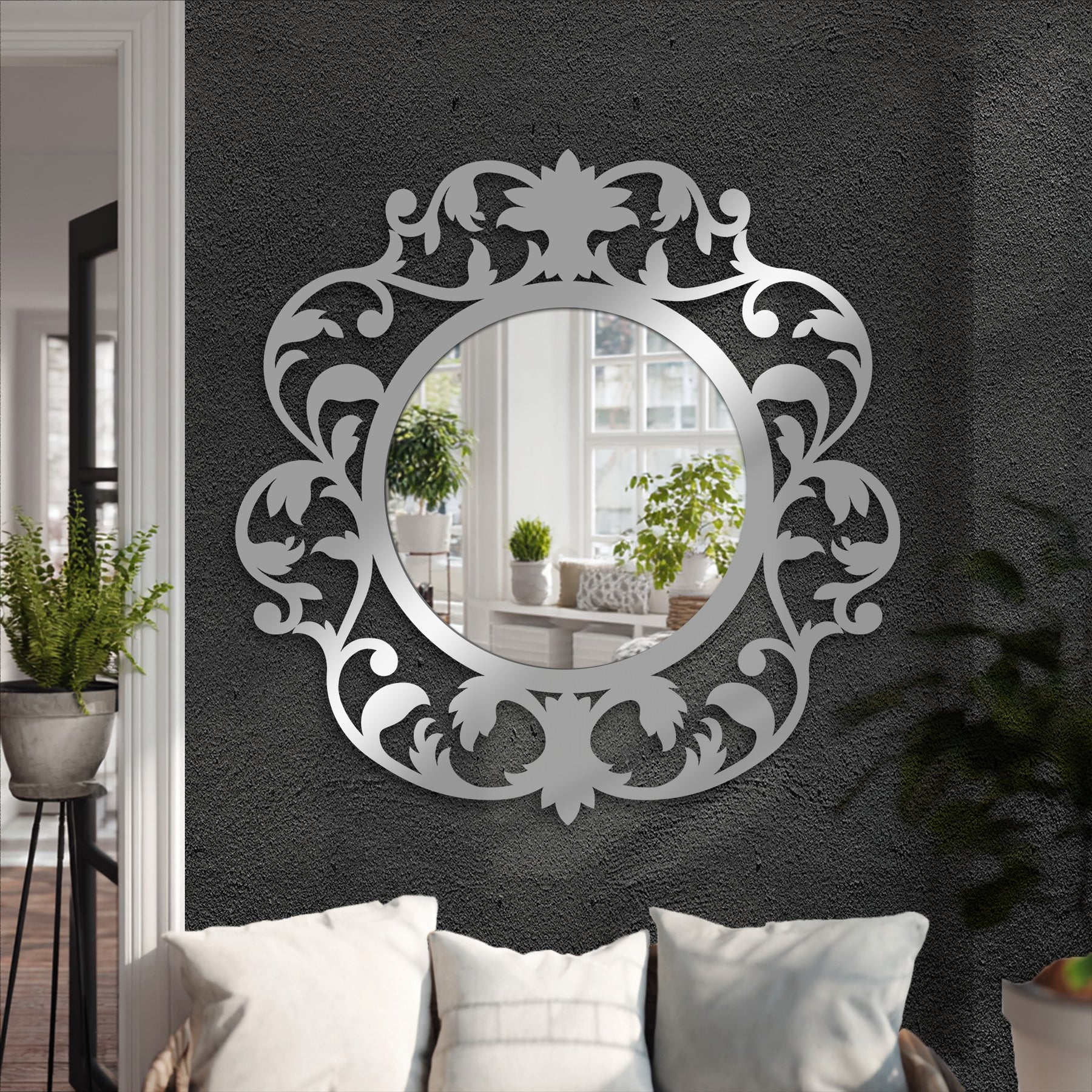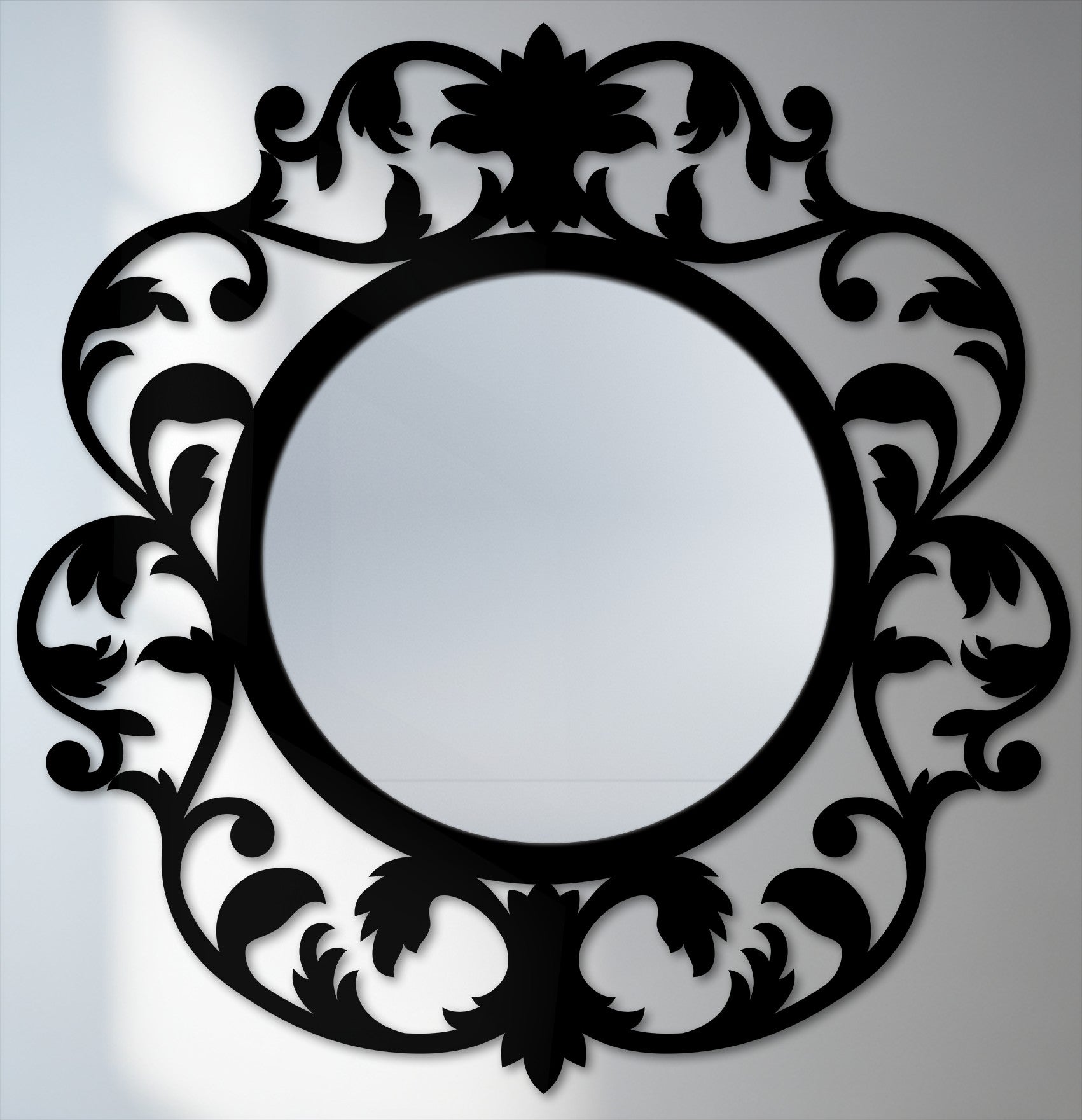 This stunning round wall mirror is framed by a richly detailed botanical silhouette inspired by vintage ornamental scrollwork. Flourishing leaves, curled stems, and a signature floral crest surround the mirror center, creating a dramatic yet elegant statement filled with movement and history.