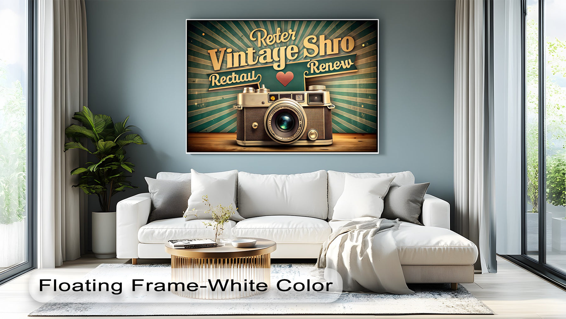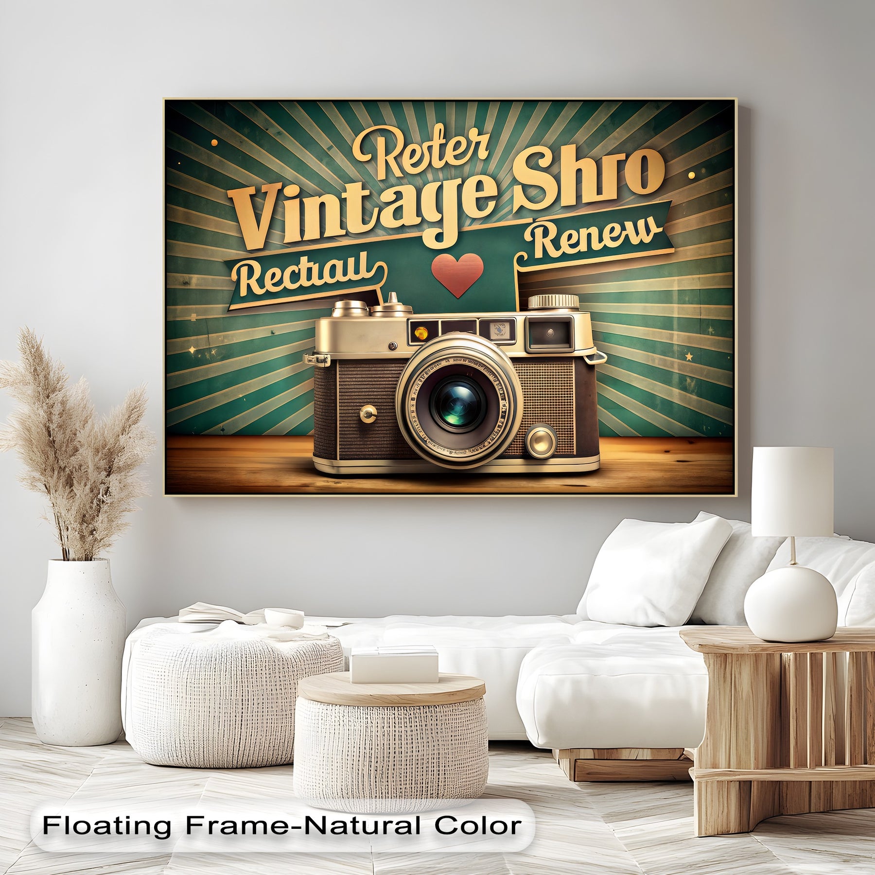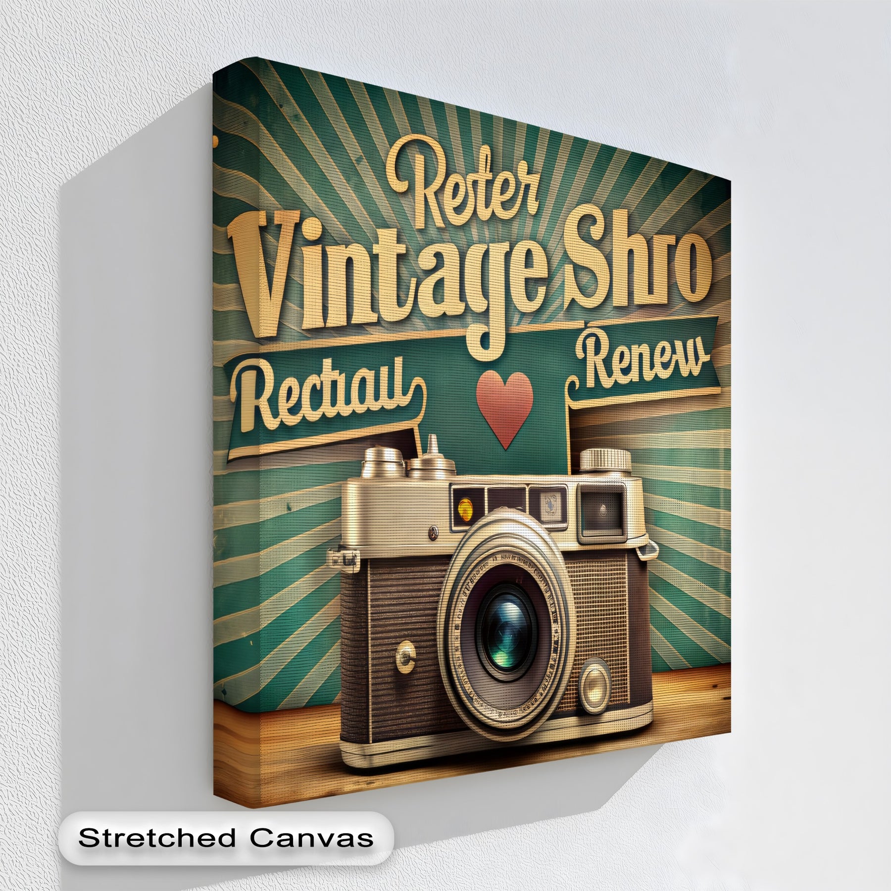 Step into a golden era of photography with this captivating canvas print. Featuring a beautifully detailed vintage camera set against a backdrop of bold teal rays and retro-style typography, the artwork exudes charm, nostalgia, and timeless appeal. The shining lens, the textured leather grip, and the heart motif all come together to evoke the joy of capturing memories.