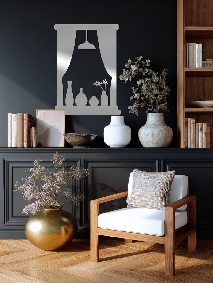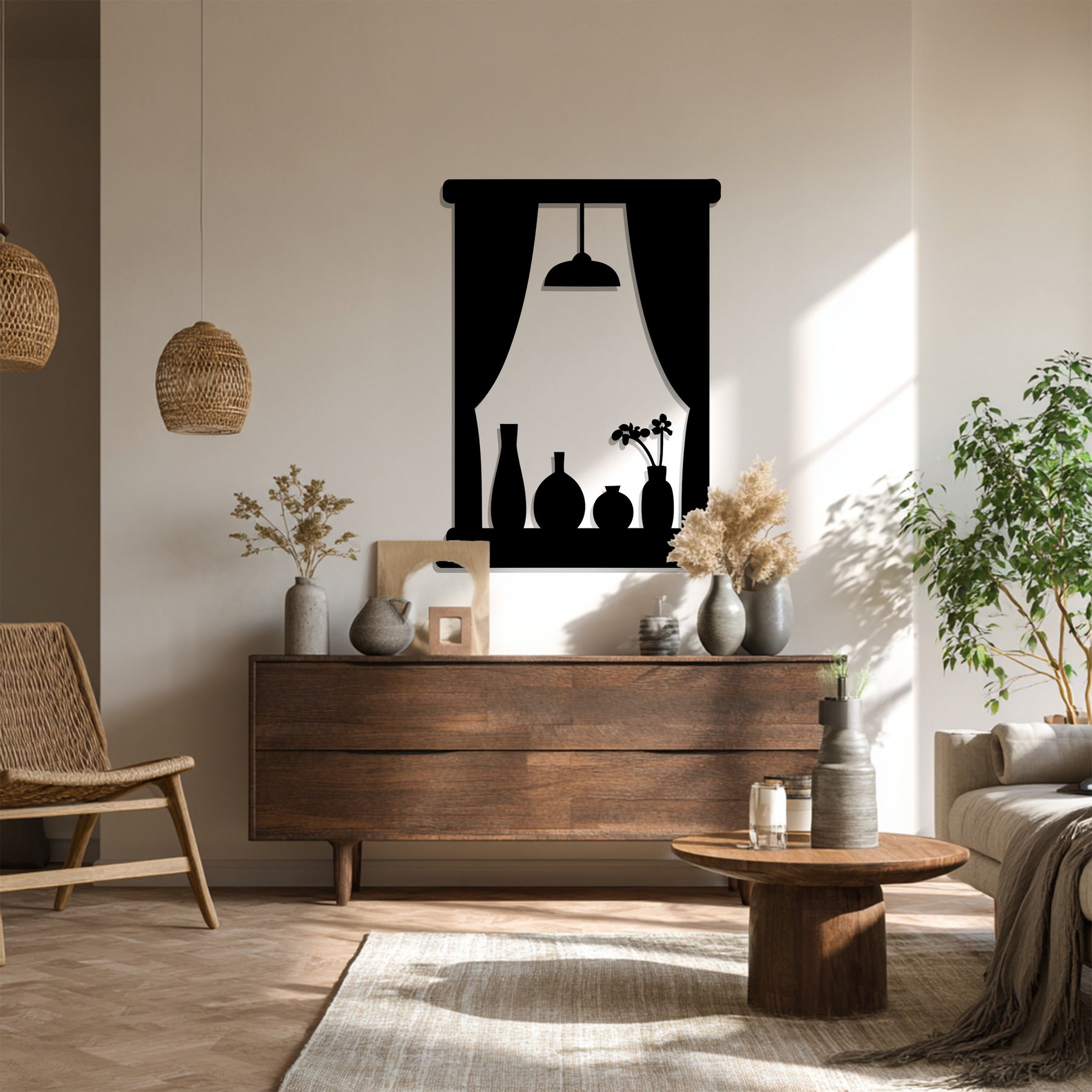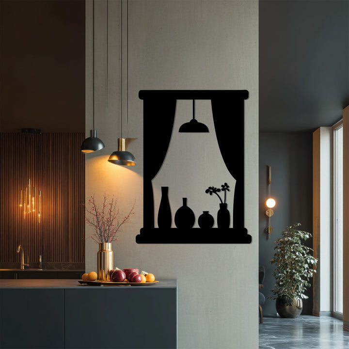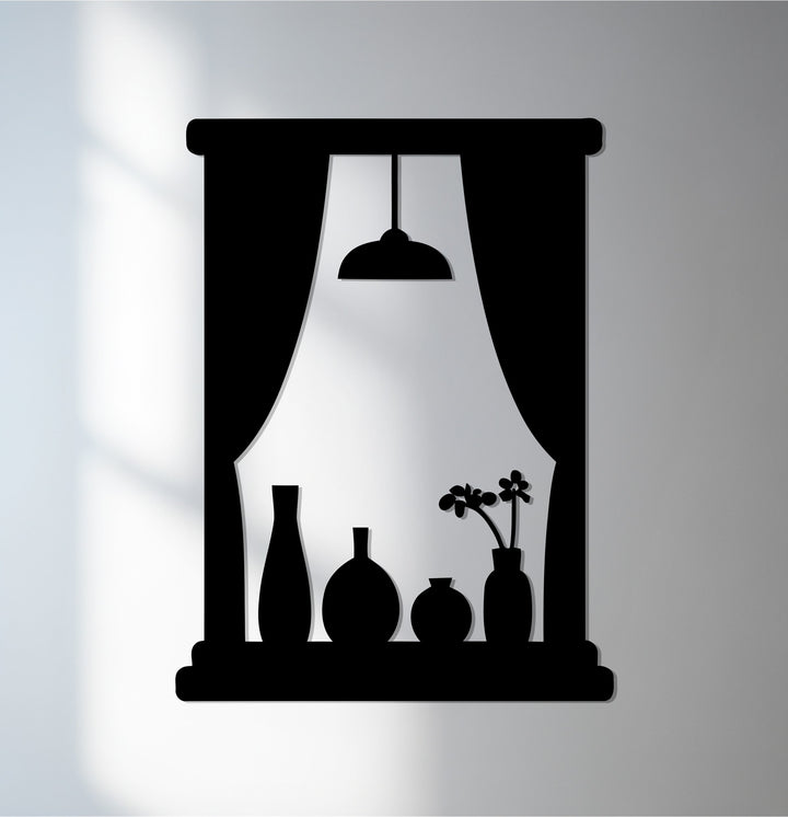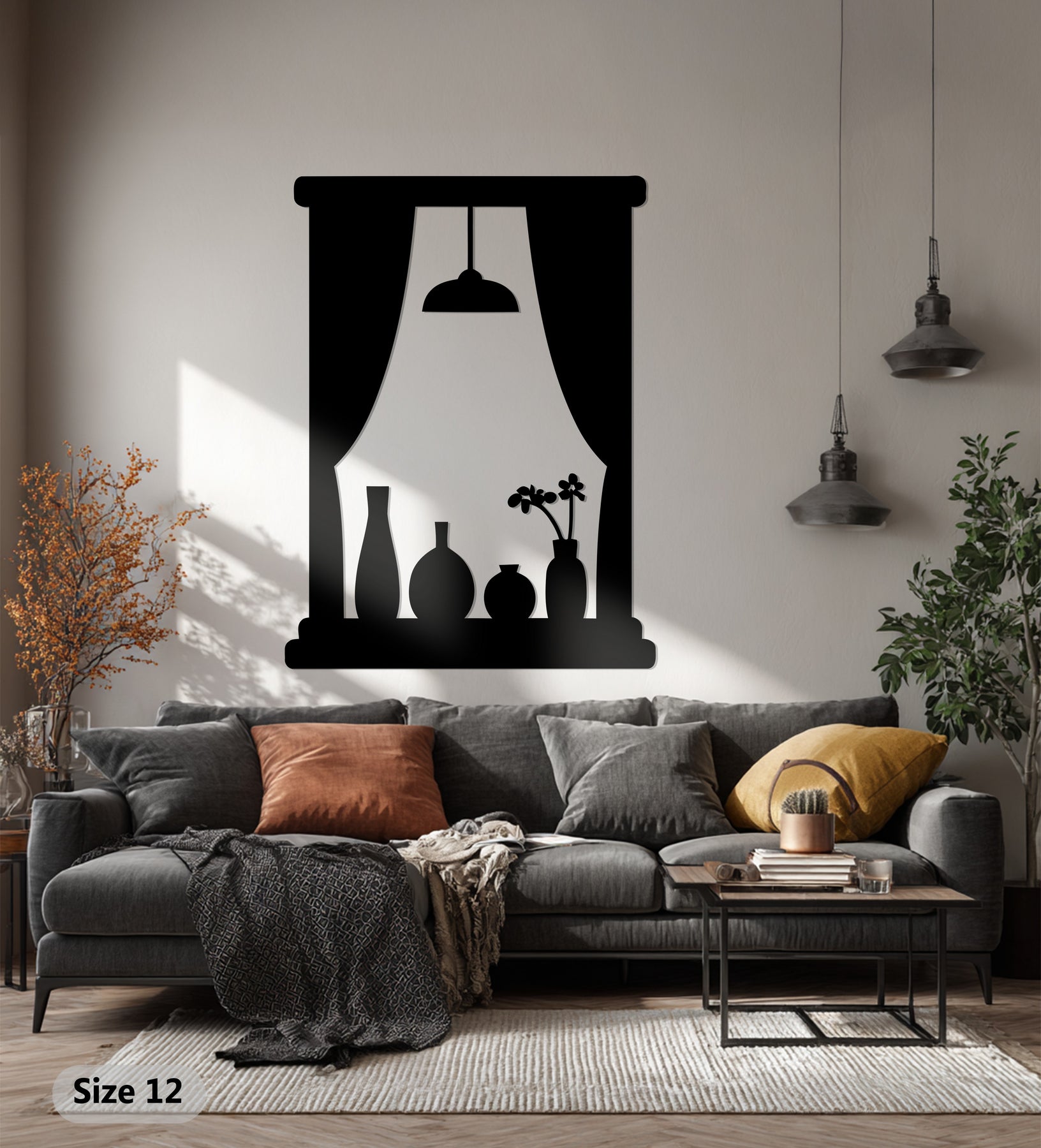 Transform your walls into a work of art with this stunning window scene metal wall decor. Featuring a graceful arrangement of vases and flowers on a windowsill, framed by elegant curtains and a hanging lamp, this design brings warmth and sophistication to any room. It captures the cozy charm of an indoor view while adding a touch of modern artistry to your home.
